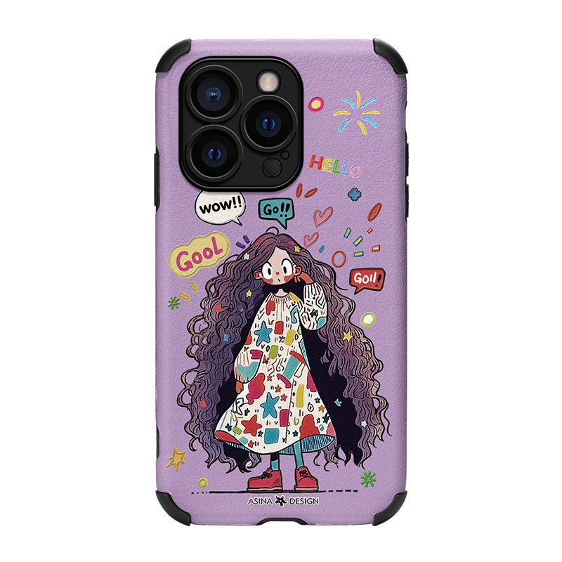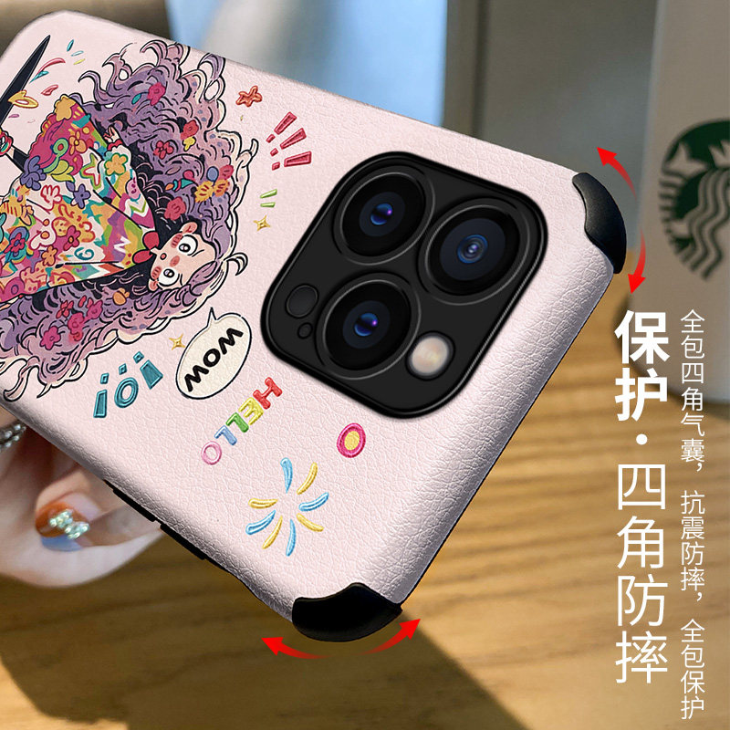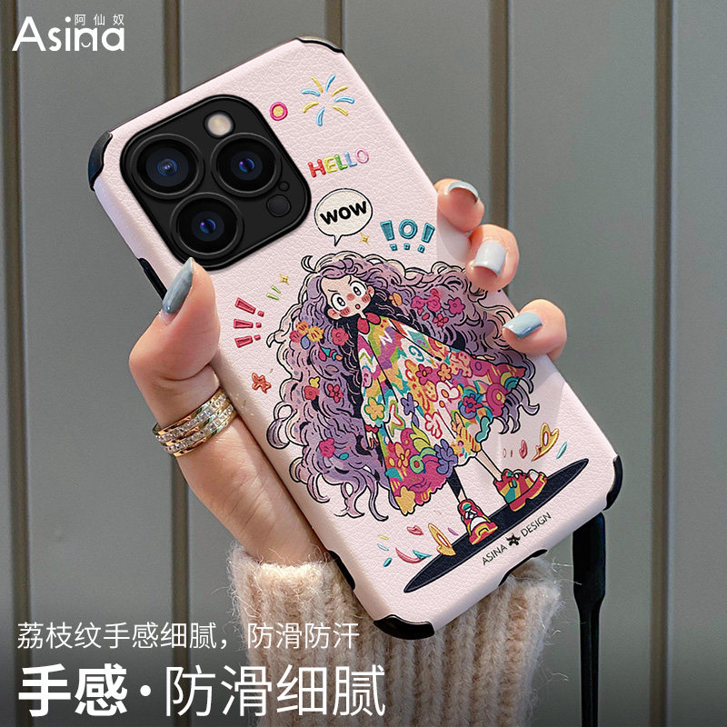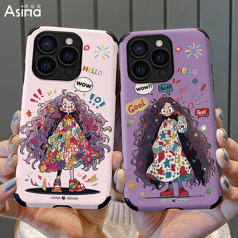 📚 卷发女孩适用苹果15Pro手机壳仿皮iPhone17Promax保护套13网红plus软全包防摔12pm女创意ip14新款小众时尚xs