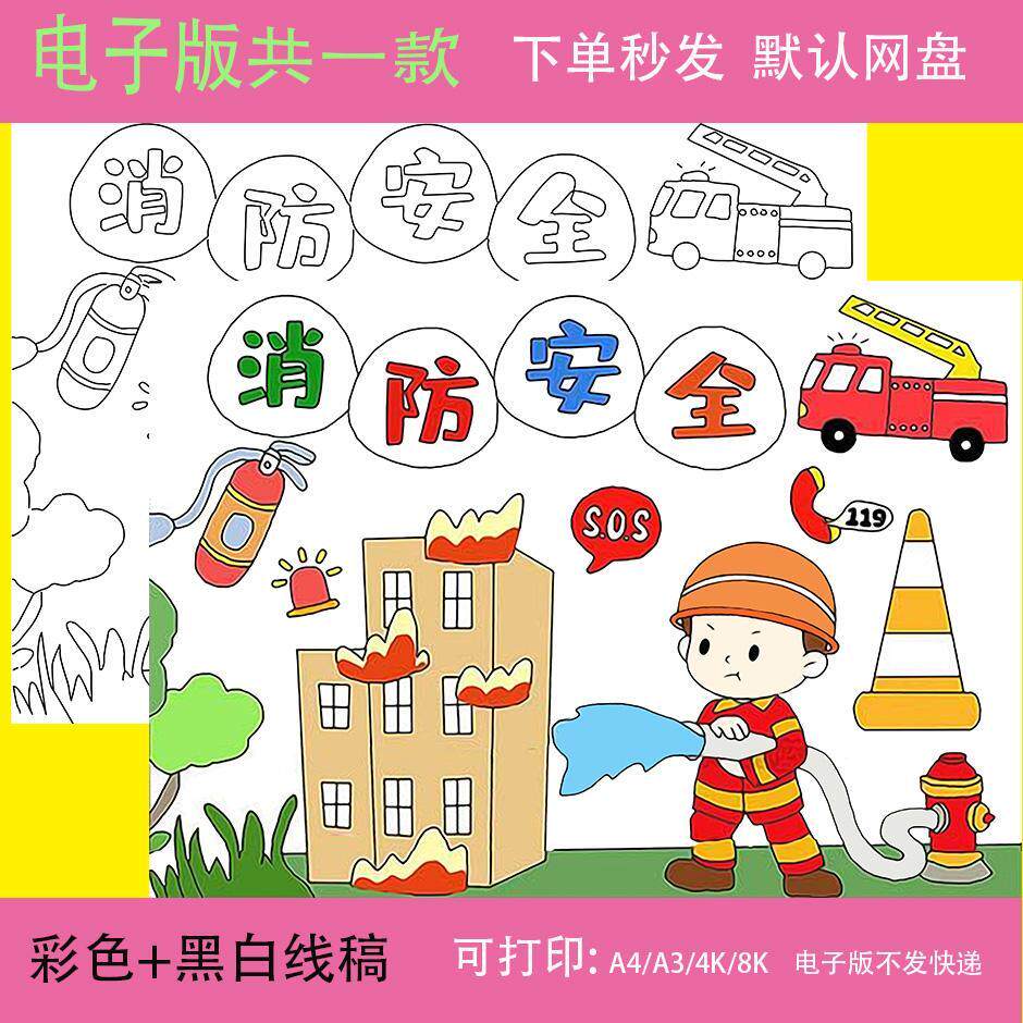 📚 消防安全手抄报教育防火灾应急灭火器主题绘画手抄报模板电子线稿