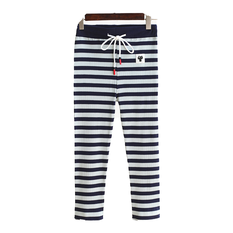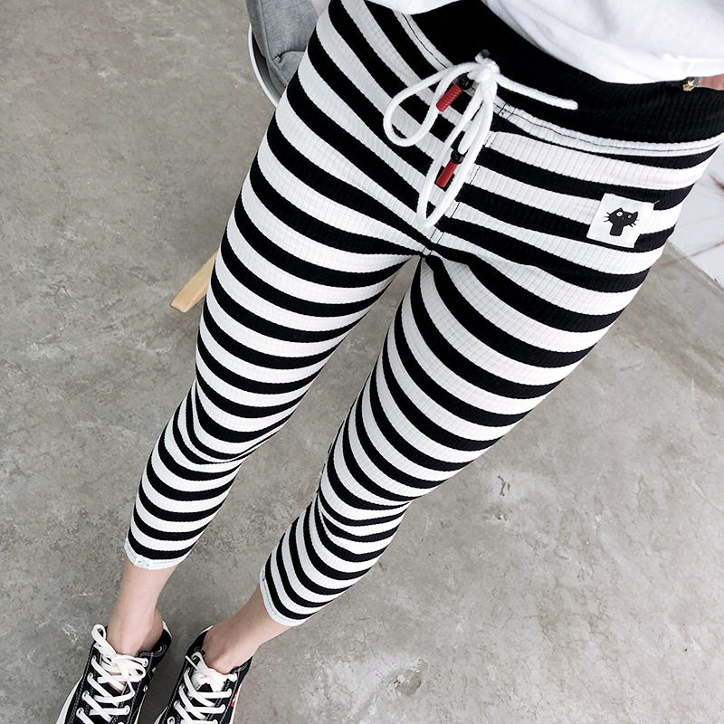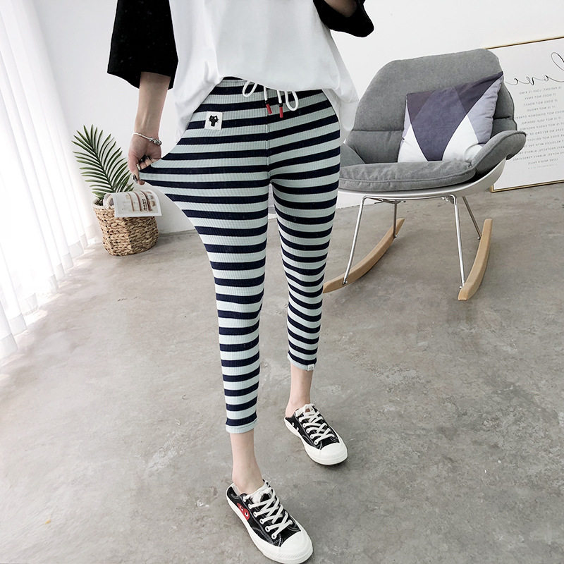 📚 2025夏季新款纯棉大弹力横条纹抽绳小猫打底裤女修身显瘦七分裤潮