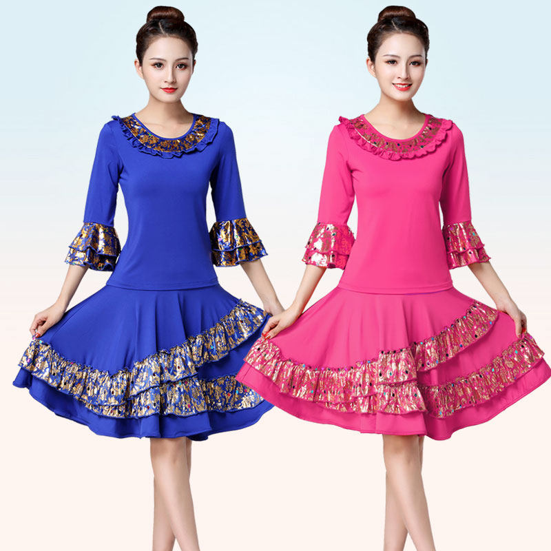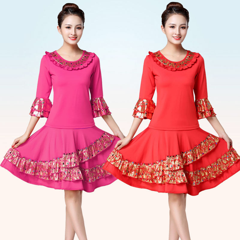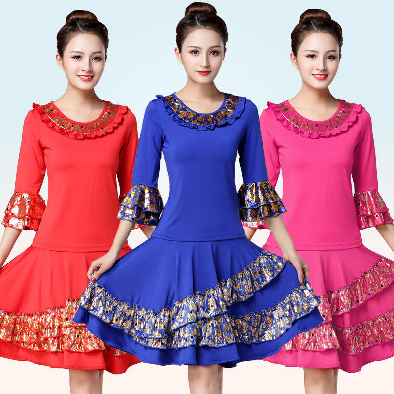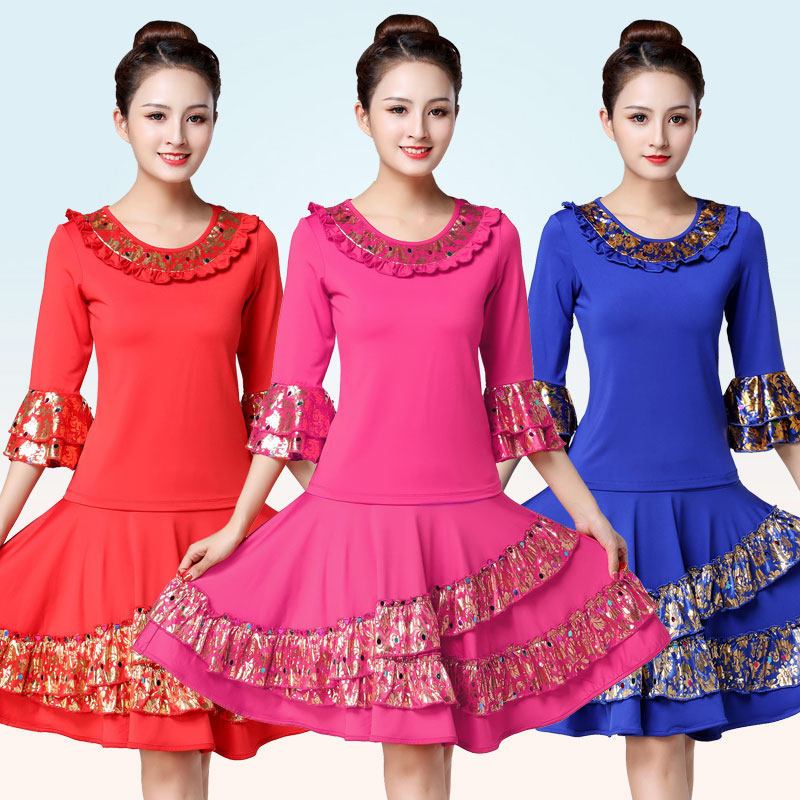 📚 新款广场舞上衣绣花中袖上衣跳舞半身裙子套装秧歌队舞蹈表演服装
