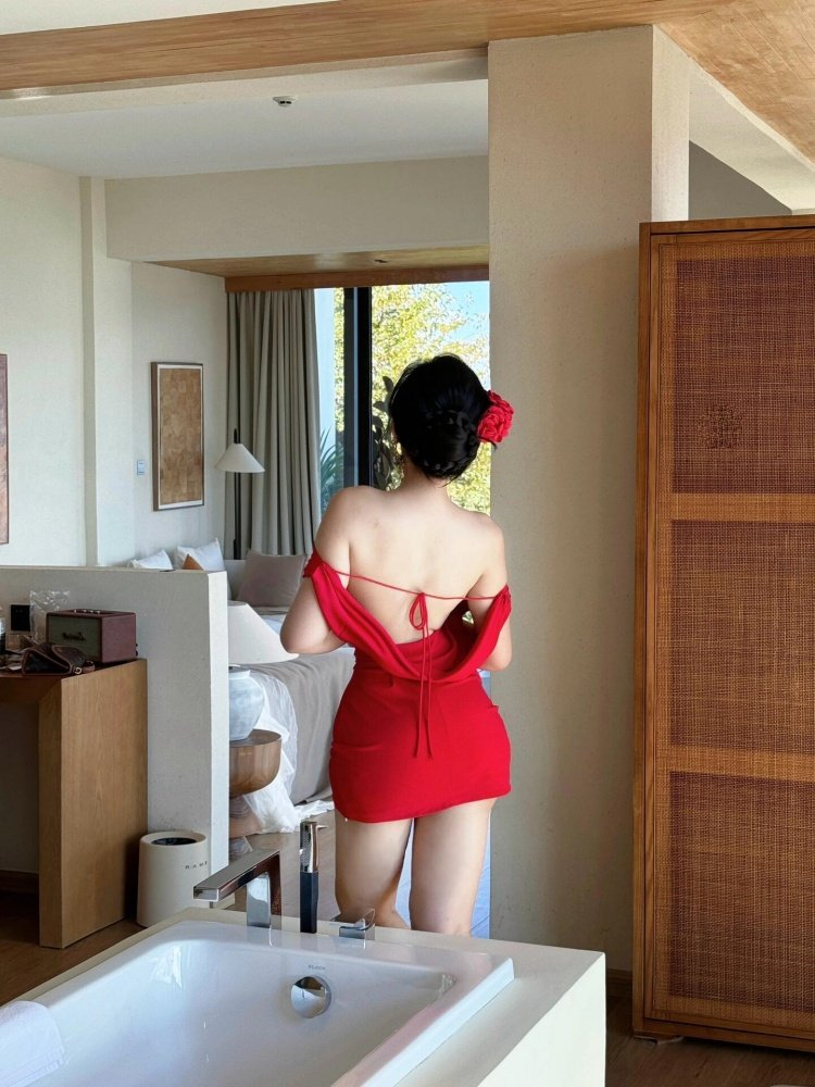 📚 古早高干文女主~轻熟御姐红色收腰包臀连衣裙显白气质露背短裙夏