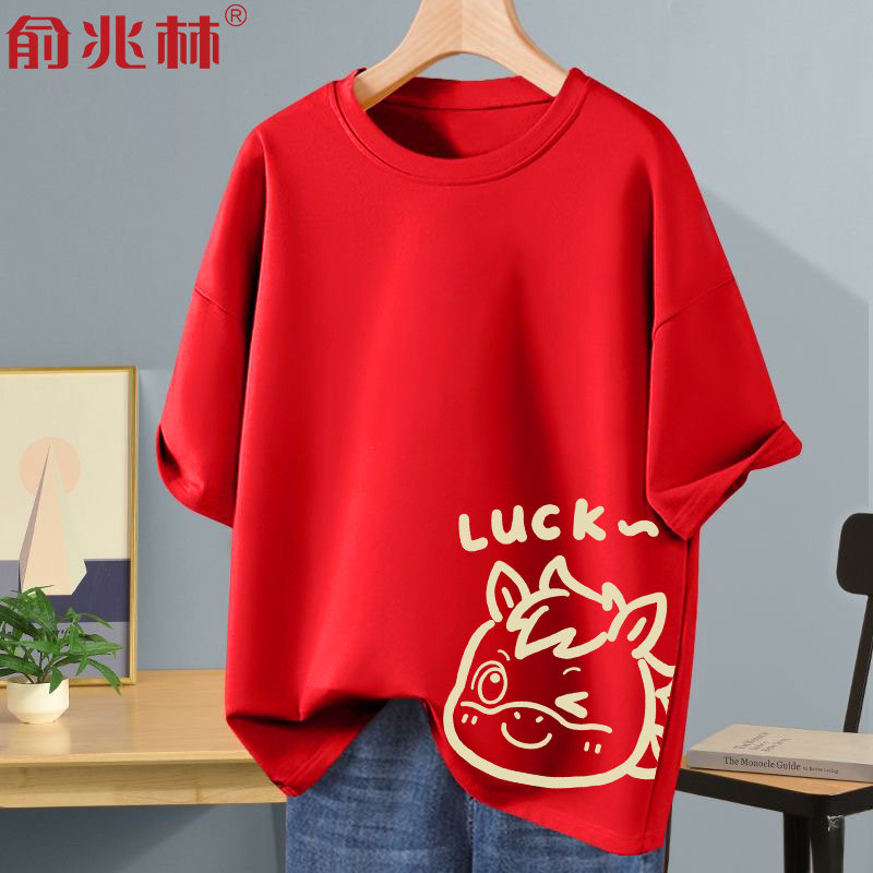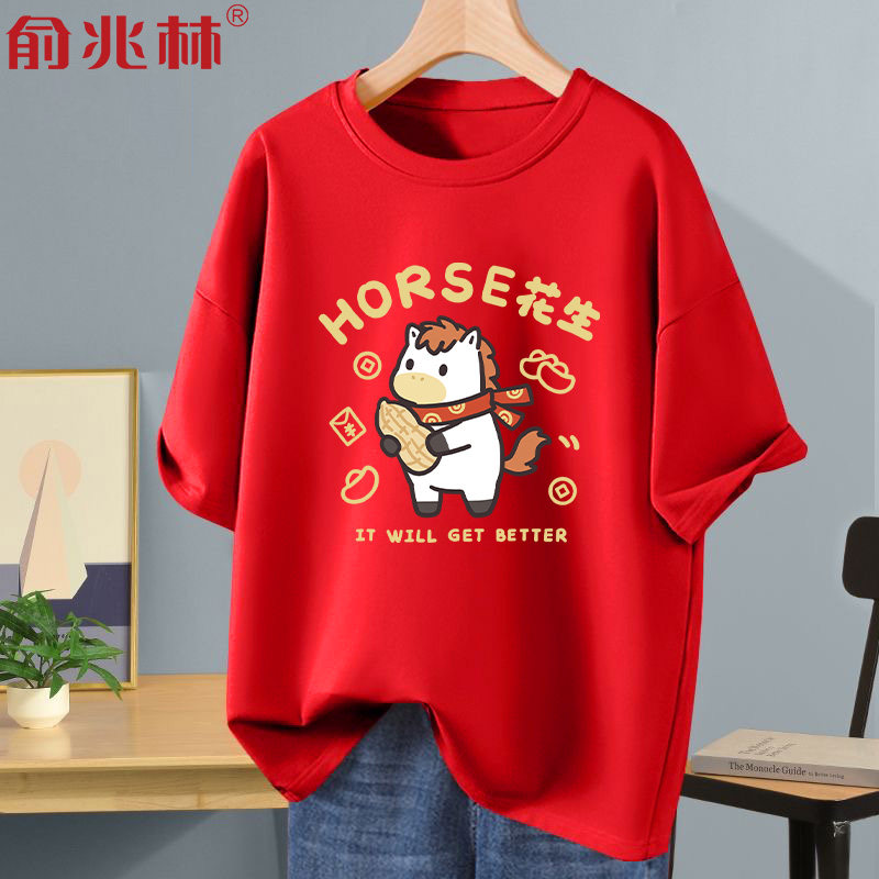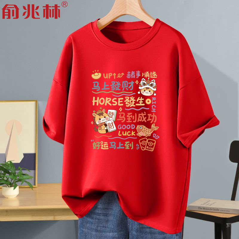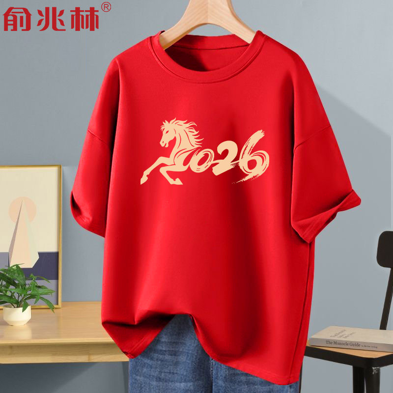 📚 2026马年本命年短袖t恤男红色喜庆纯棉半袖元旦年会表演团队服装