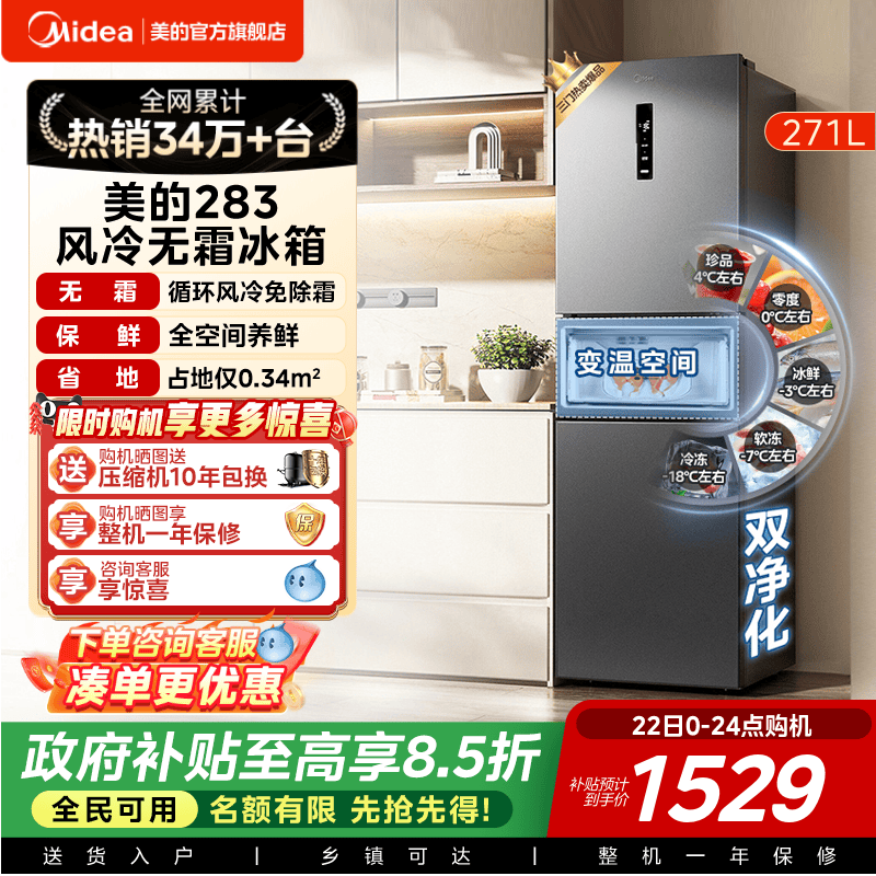 📚 美的283三开门电冰箱一级能效家用变频风冷无霜小型超薄官方租房