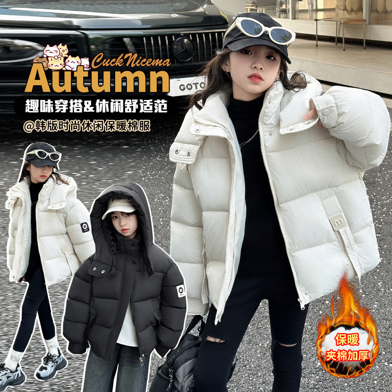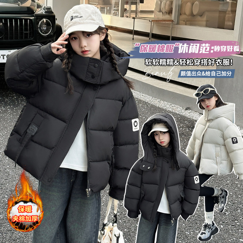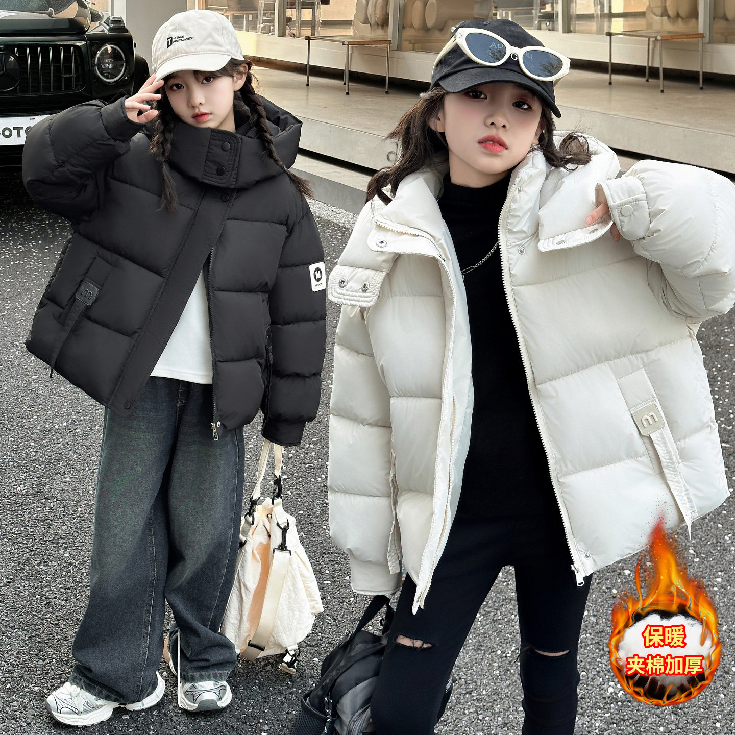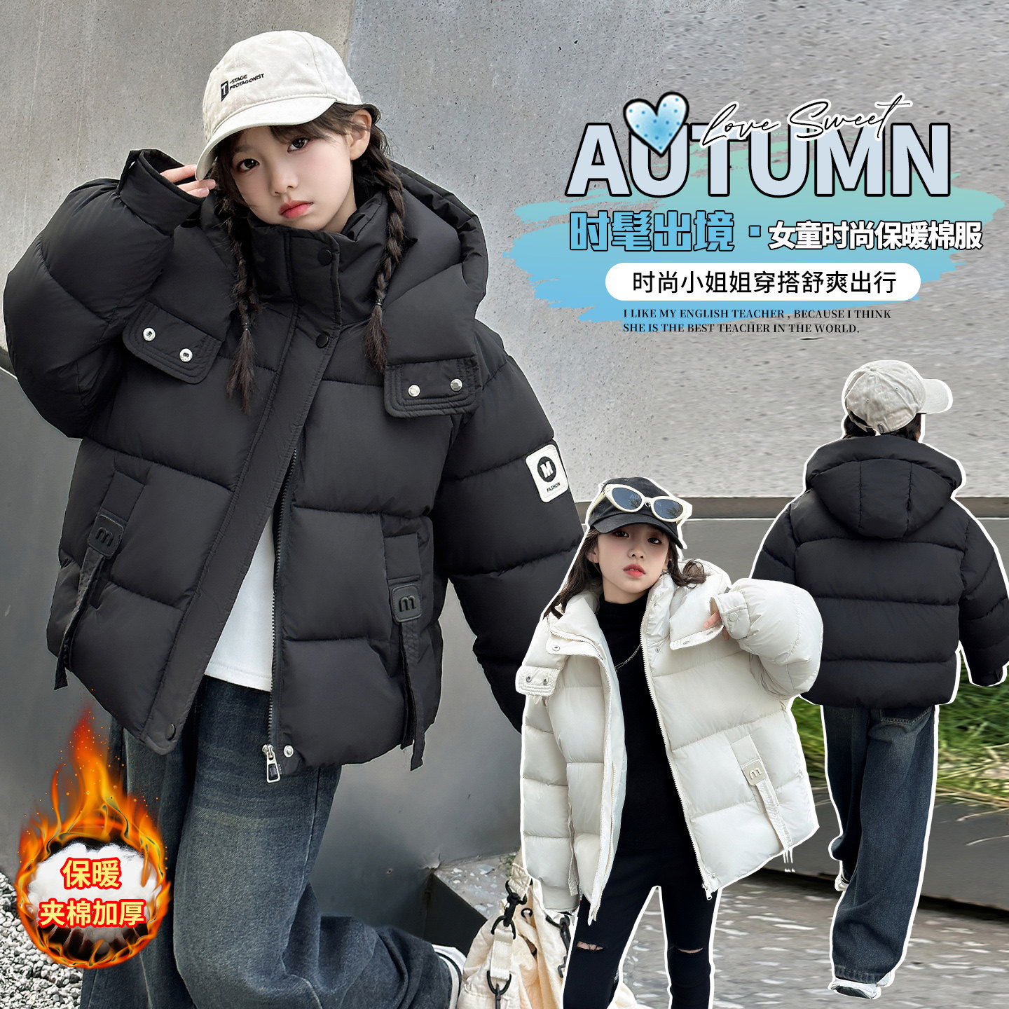 📚 女童棉服加厚韩版冬装2025新款洋气羽绒棉衣中大童连帽围巾领棉袄