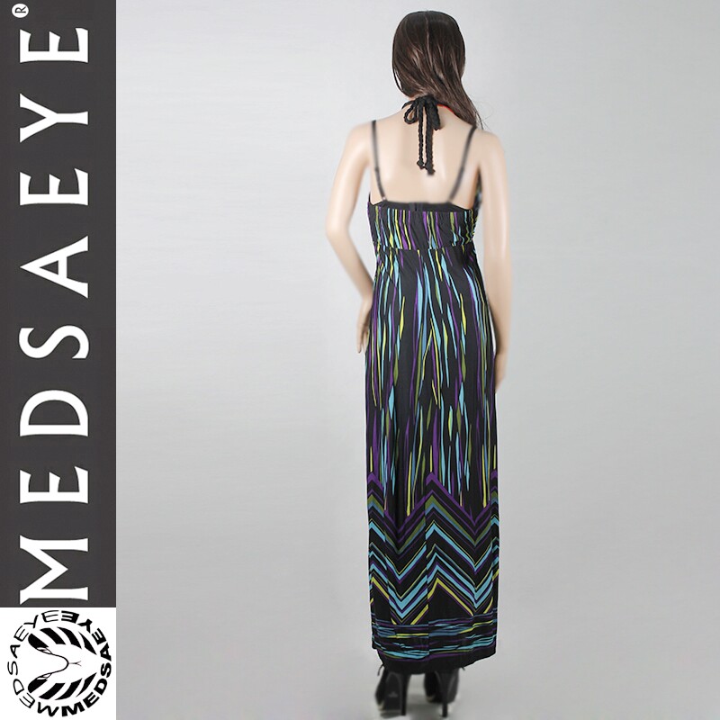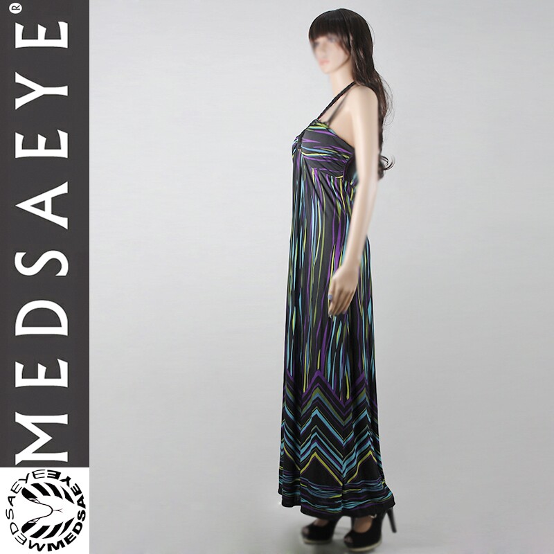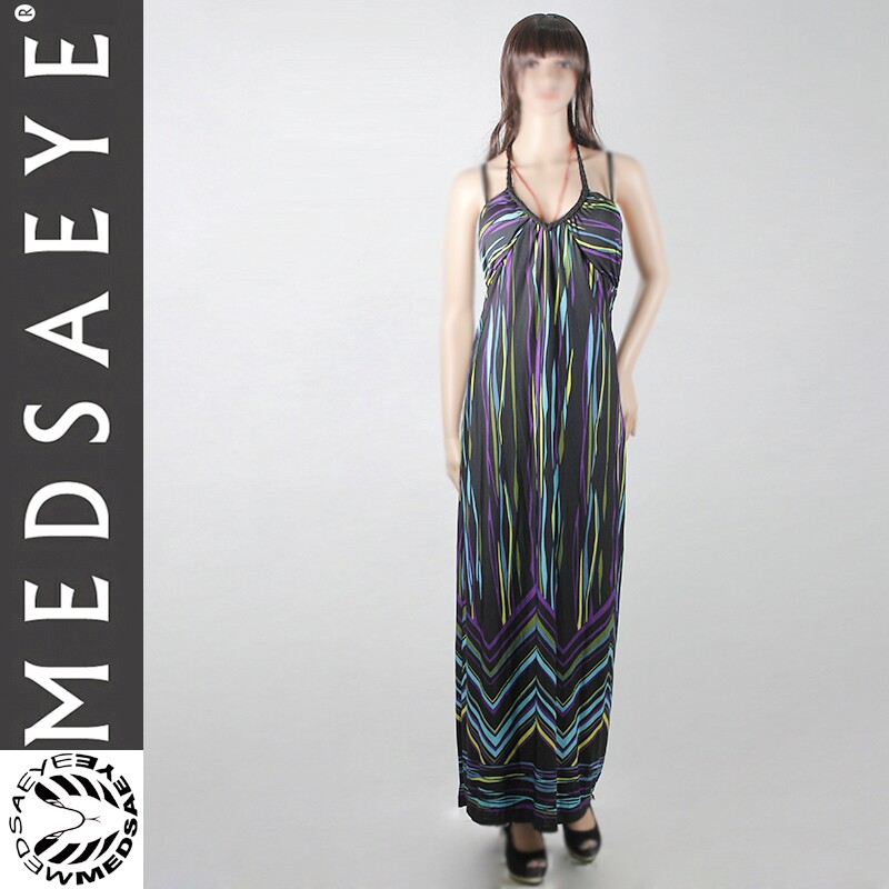 📚 黑绿紫条纹花色编织挂脖连身长裙