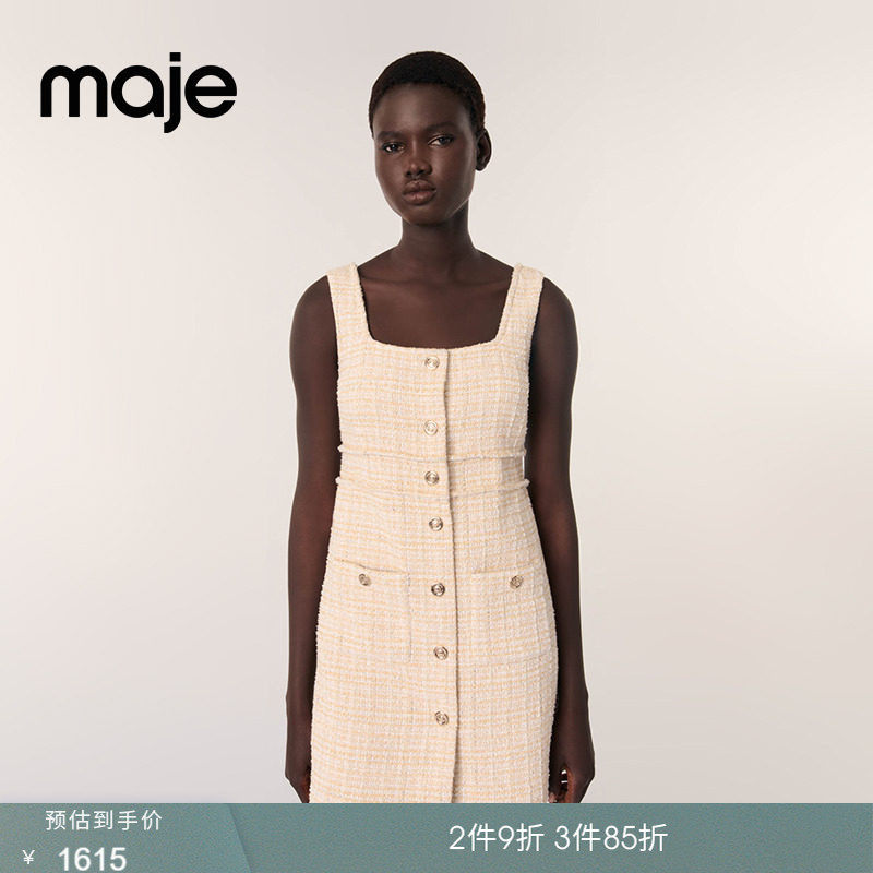 📚 Maje2025春夏女装法式时尚粗花呢米黄色方领无袖短款吊带连衣裙