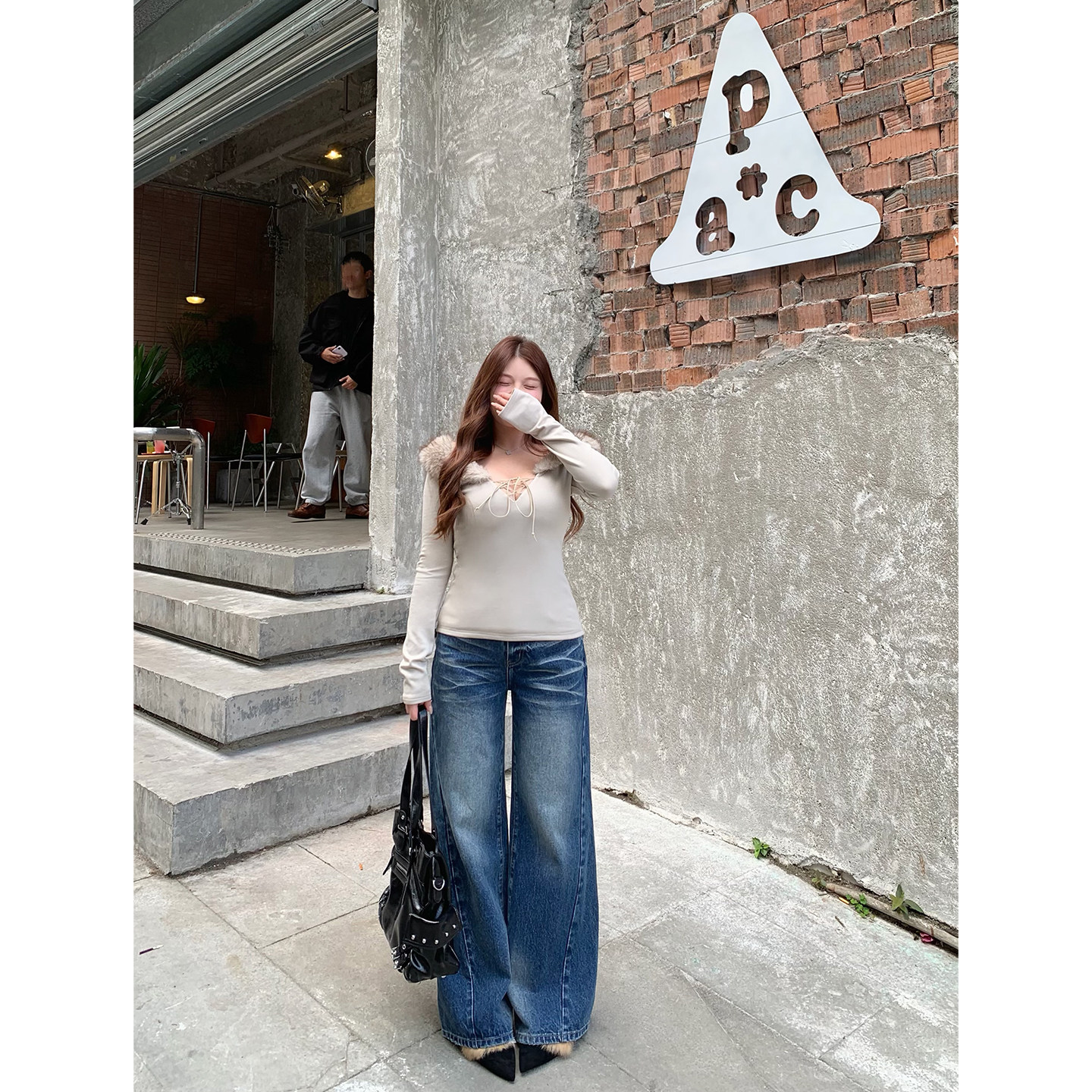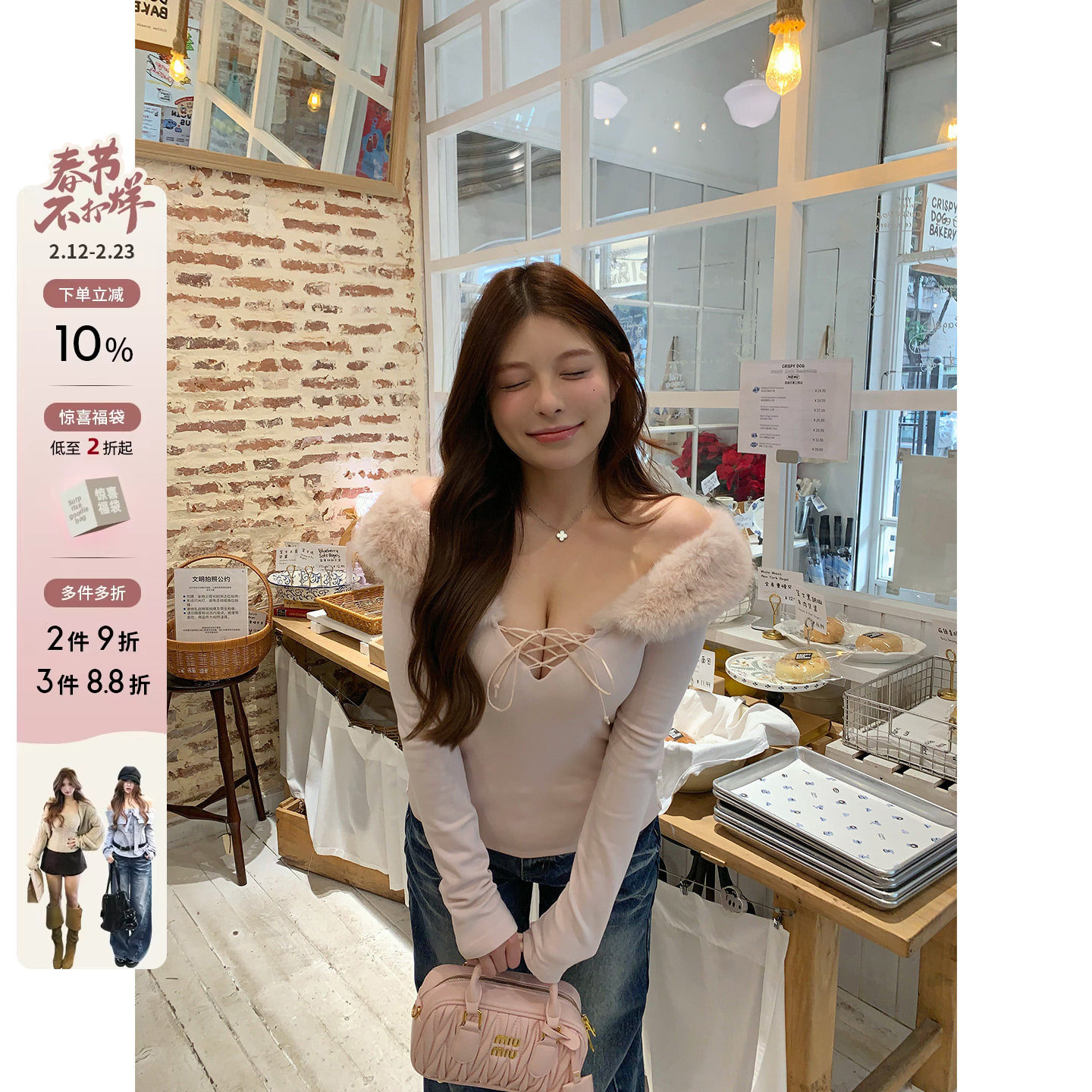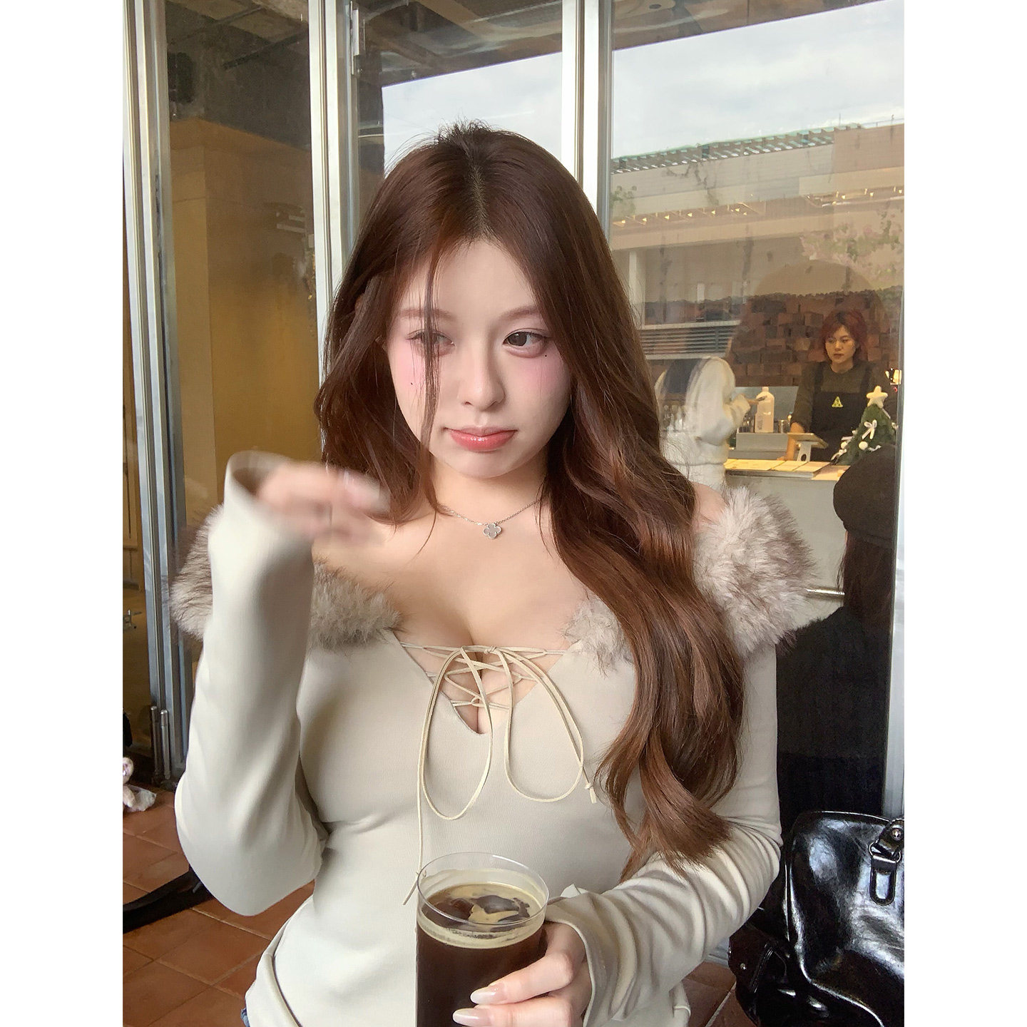 📚 你的鱼 欲系芭蕾 韩系微胖mm纯欲性感设计感毛领交叉绑带春款上衣