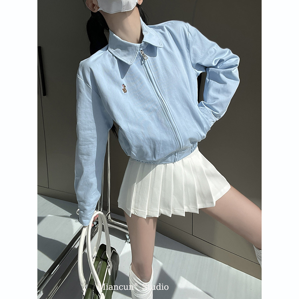 📚 轻氧系babyblue苎麻棉自制刺绣慵懒松弛感夹克蓝色工装短款外套女