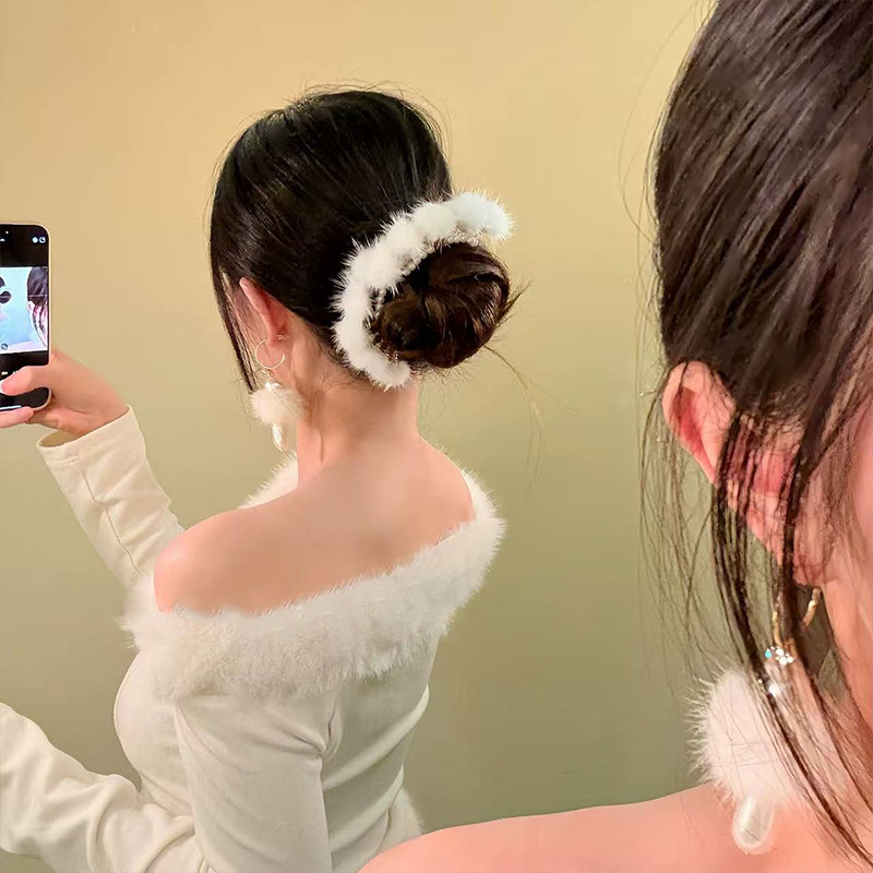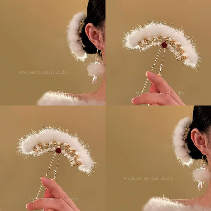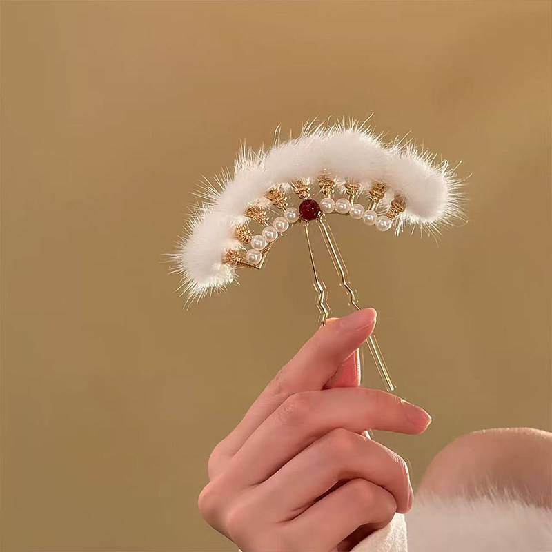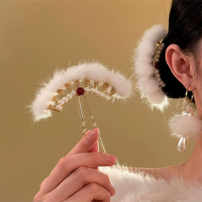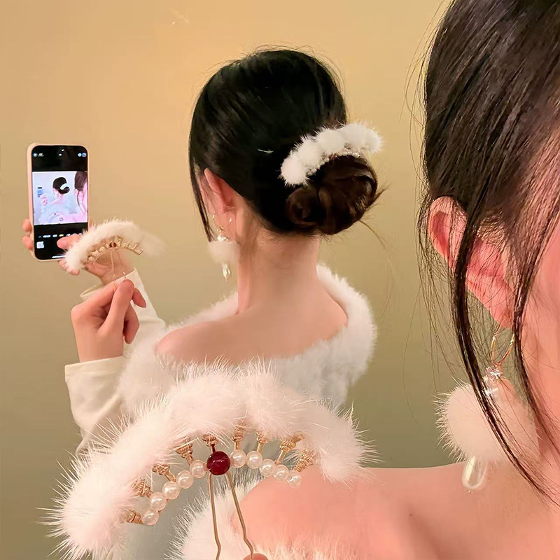 📚 新中式超仙毛绒球球发簪女高级感2026新款冬日汉服古风旗袍头饰品