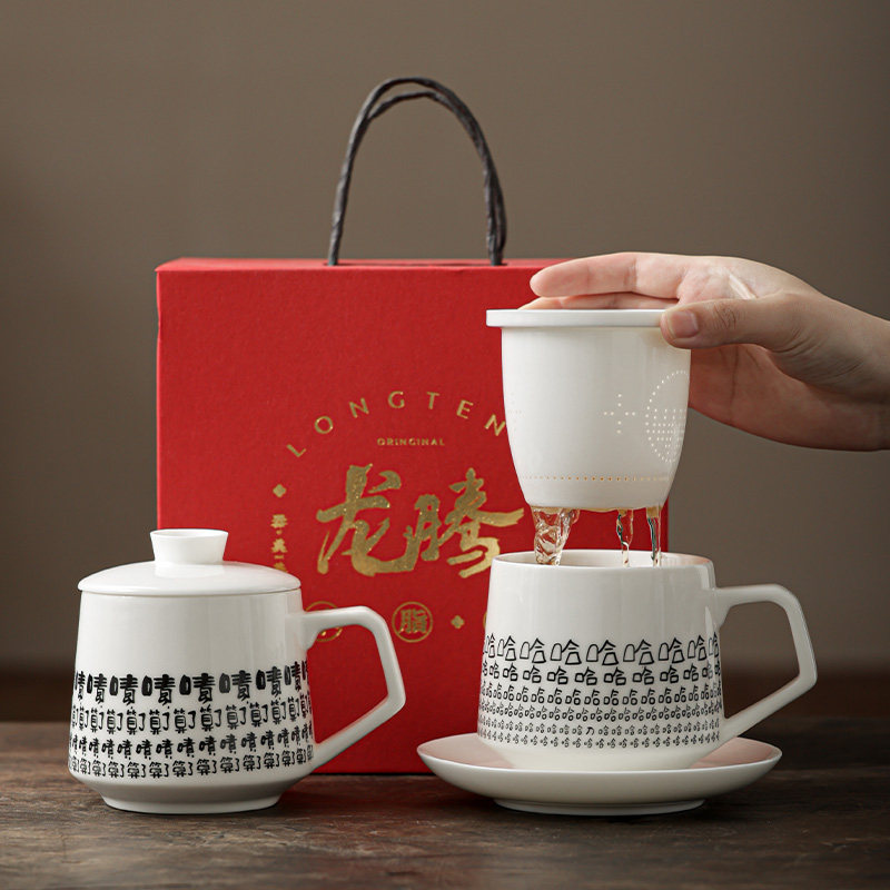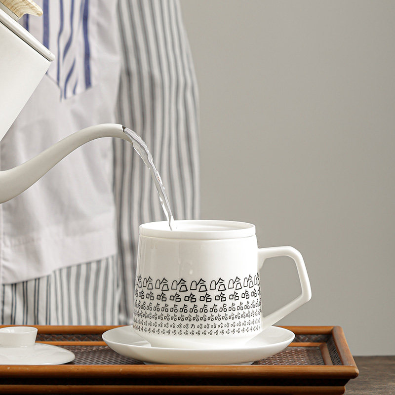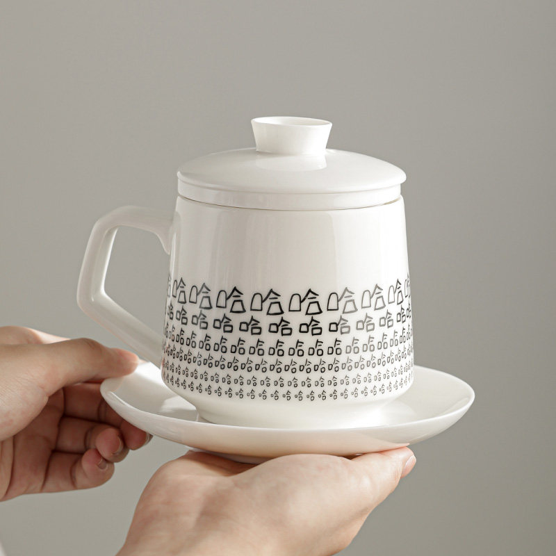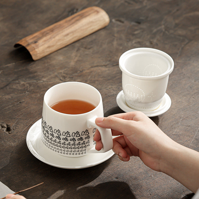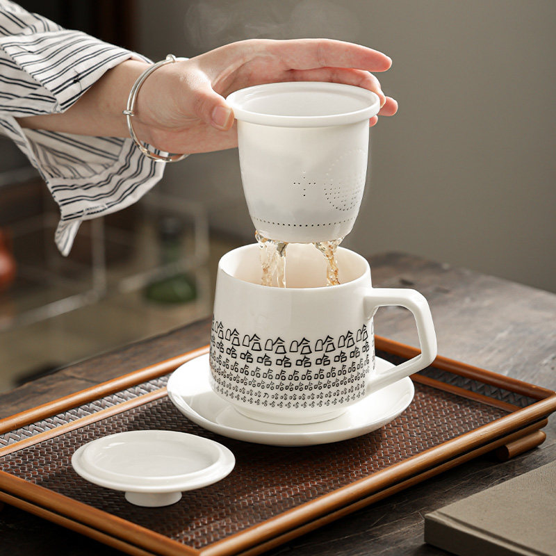 📚 白瓷茶杯办公杯陶瓷带盖水杯茶水分离泡茶杯家用笑里藏刀哈哈杯