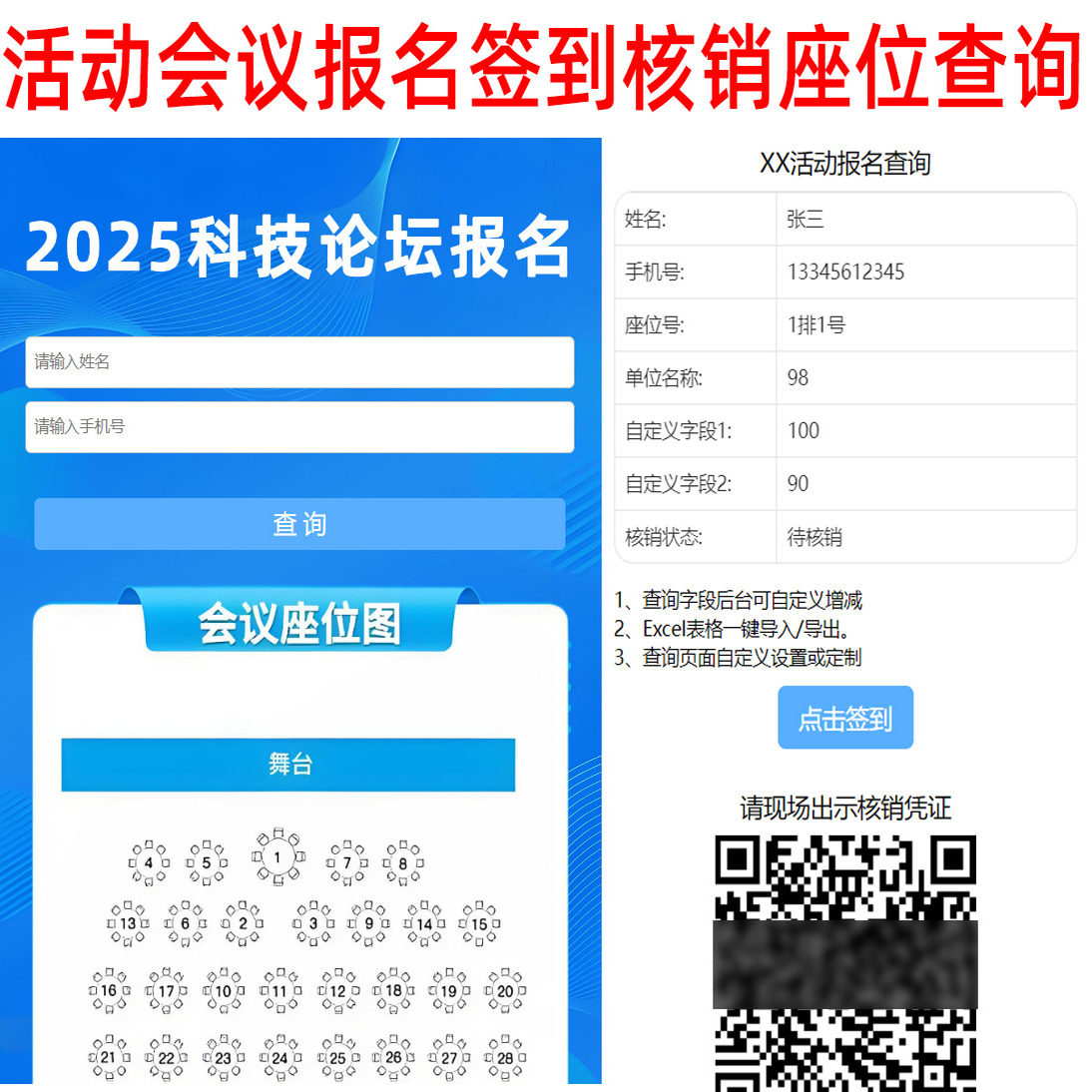 📚 H5会议签到系统核销报名座位预约管理二维码学生成绩分数查询定制