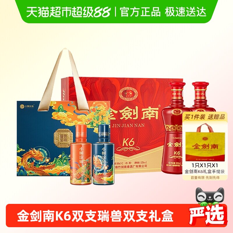 📚 剑南春K6双支礼盒52度500ml*2瓶礼盒装+小糊涂仙瑞兽呈祥小酒礼盒