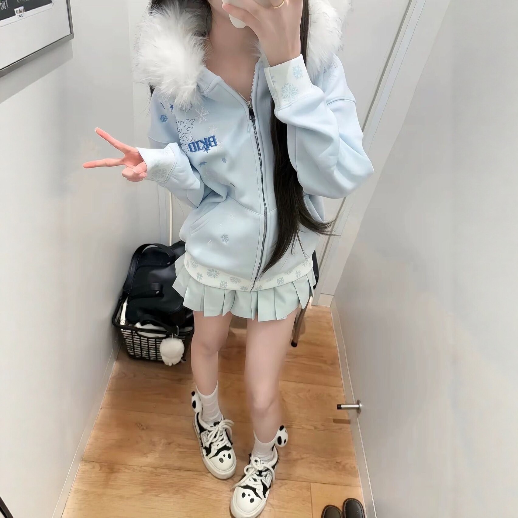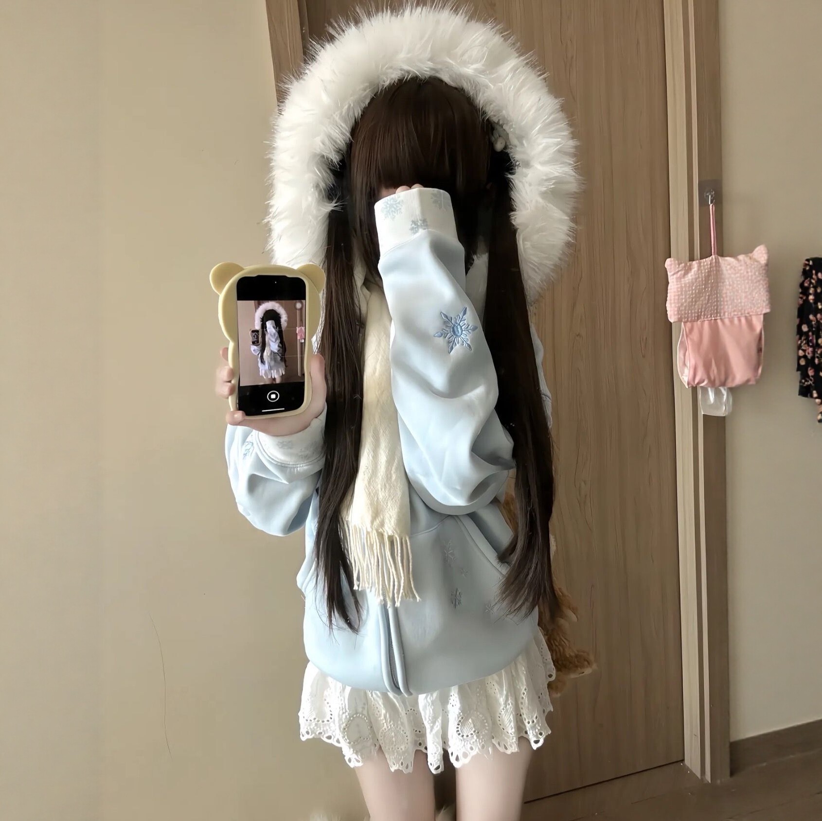 📚 国潮Baby蓝雪花刺绣连帽毛领卫衣外套女加绒保暖学院风小个子上衣