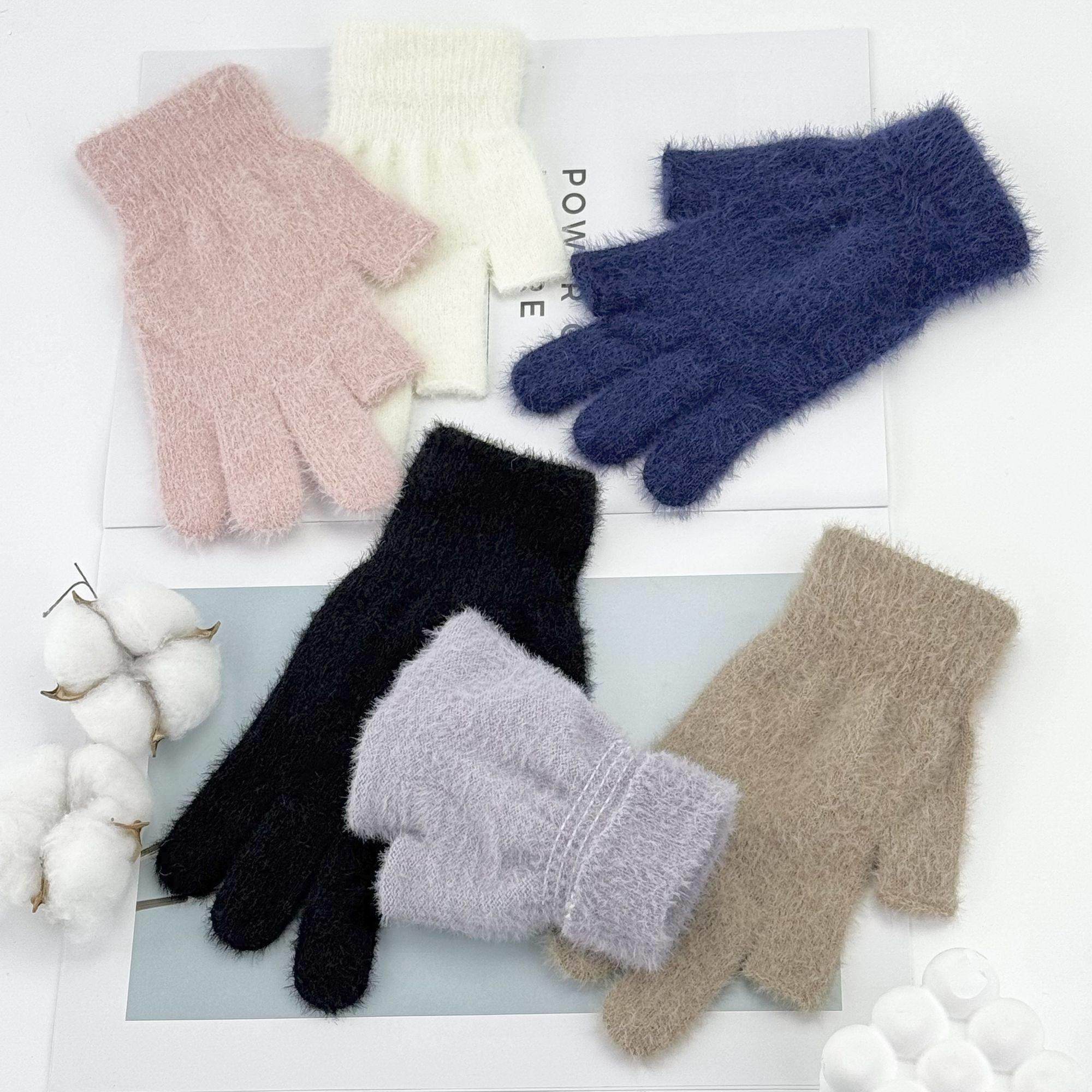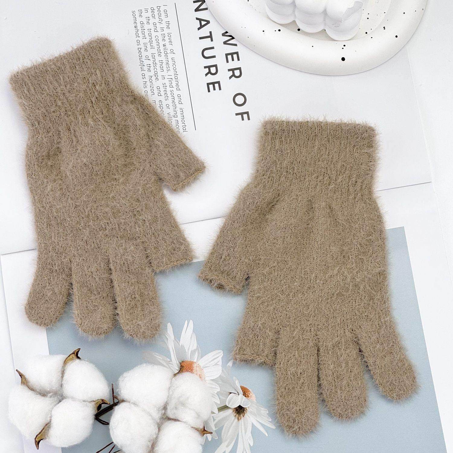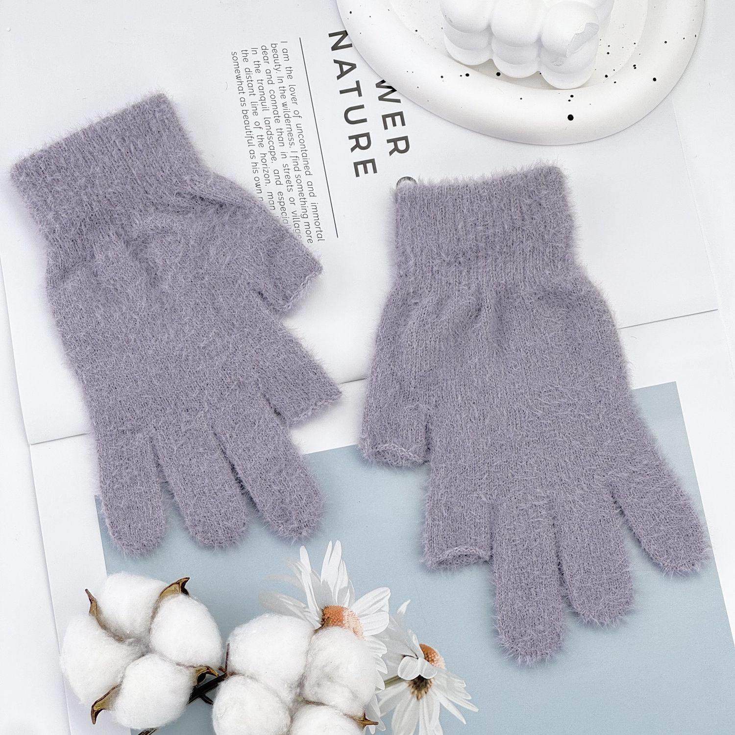 📚 漏指头加绒加厚保暖手套冬季纯色学生写字游戏触屏针织可爱手套