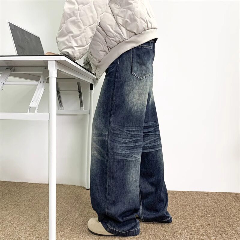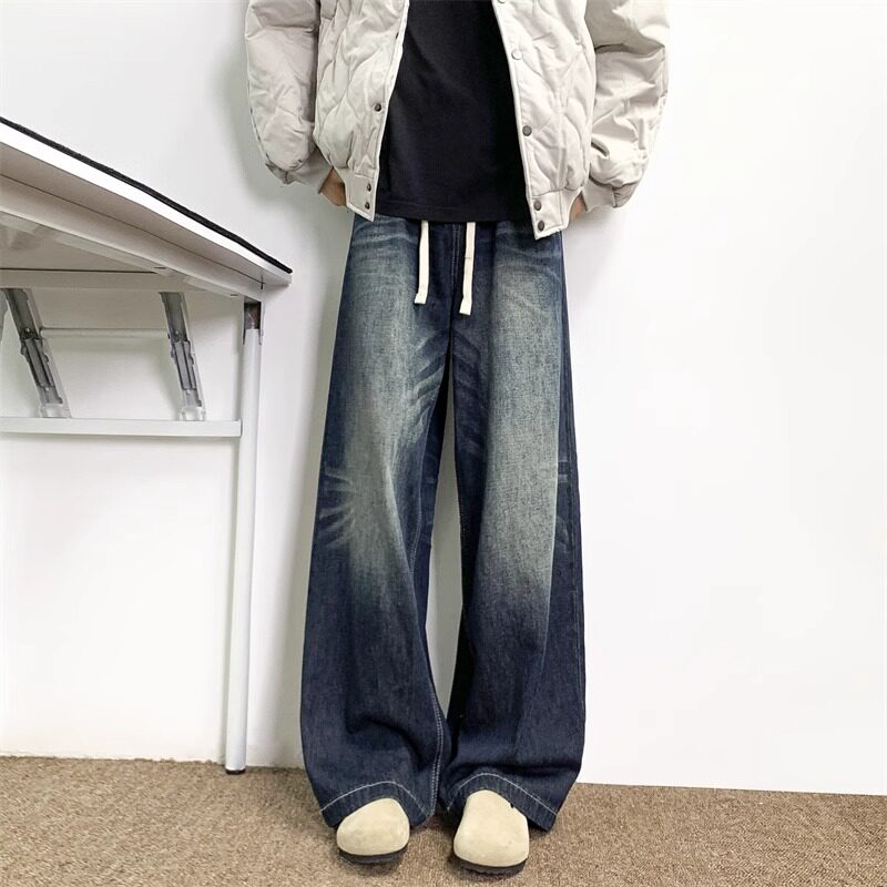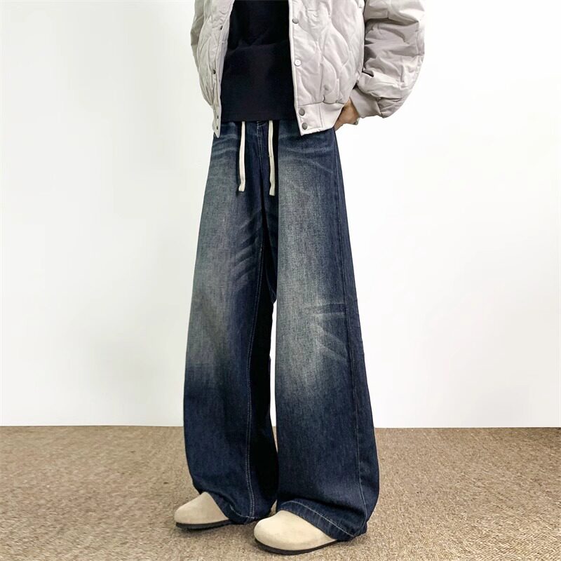 📚 深蓝色水洗牛仔裤男夏季美式复古baggy宽松百搭抽绳阔腿直筒裤子
