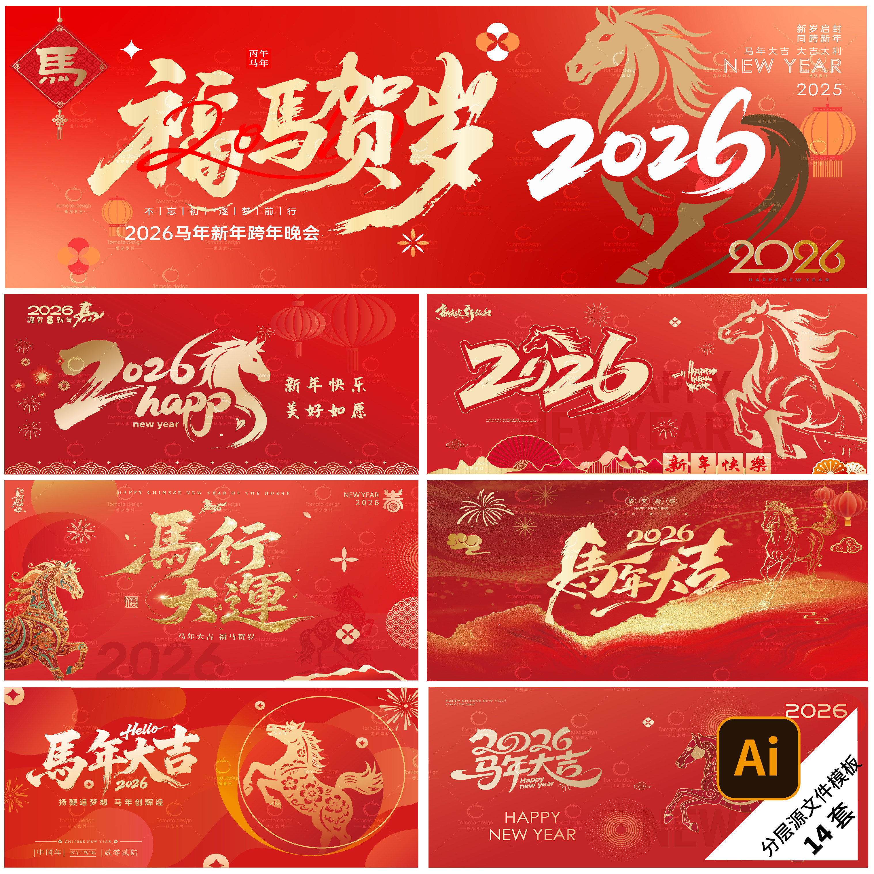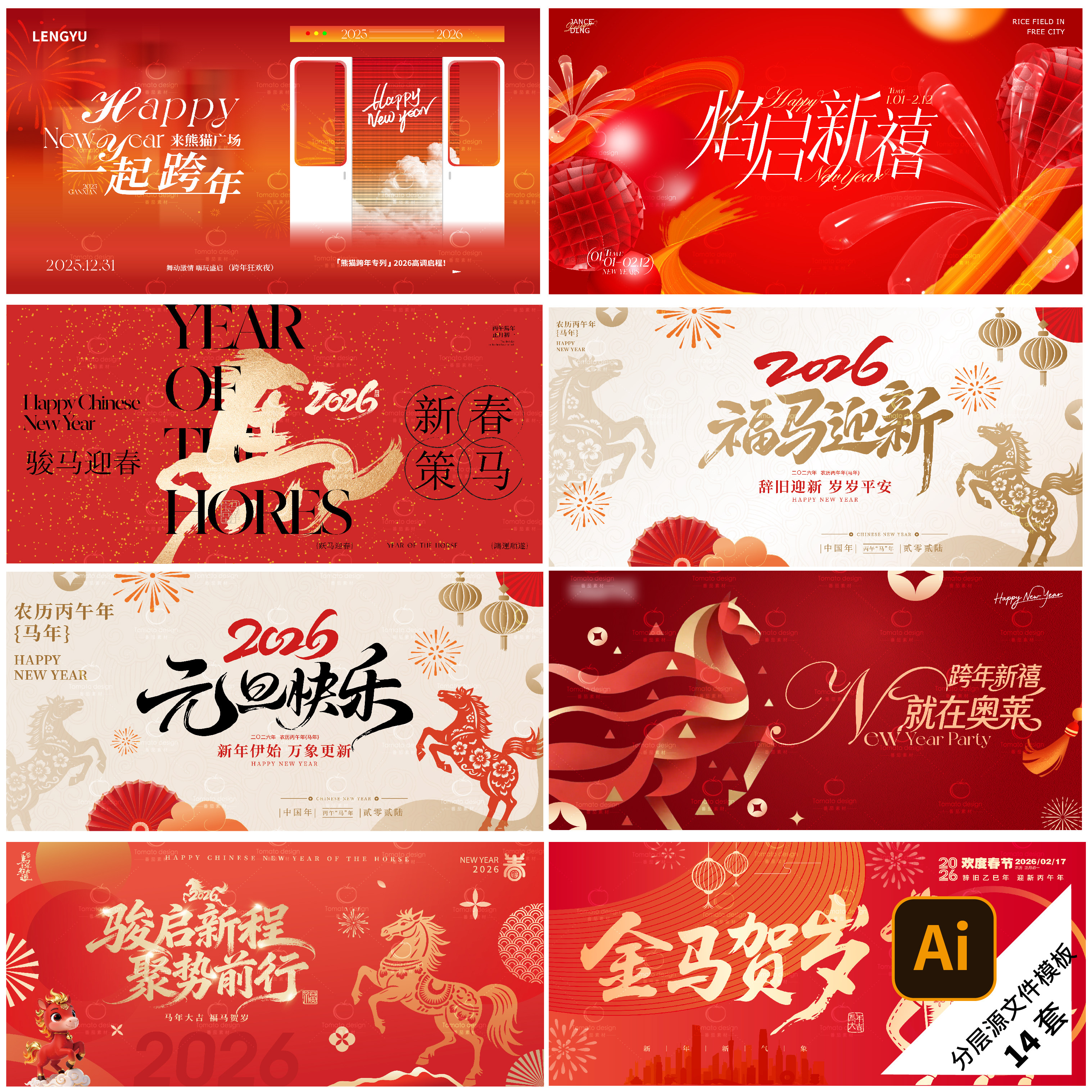 📚 B535元旦展板新年2026马年春节海报背板kv大屏插画地产矢量AI模版