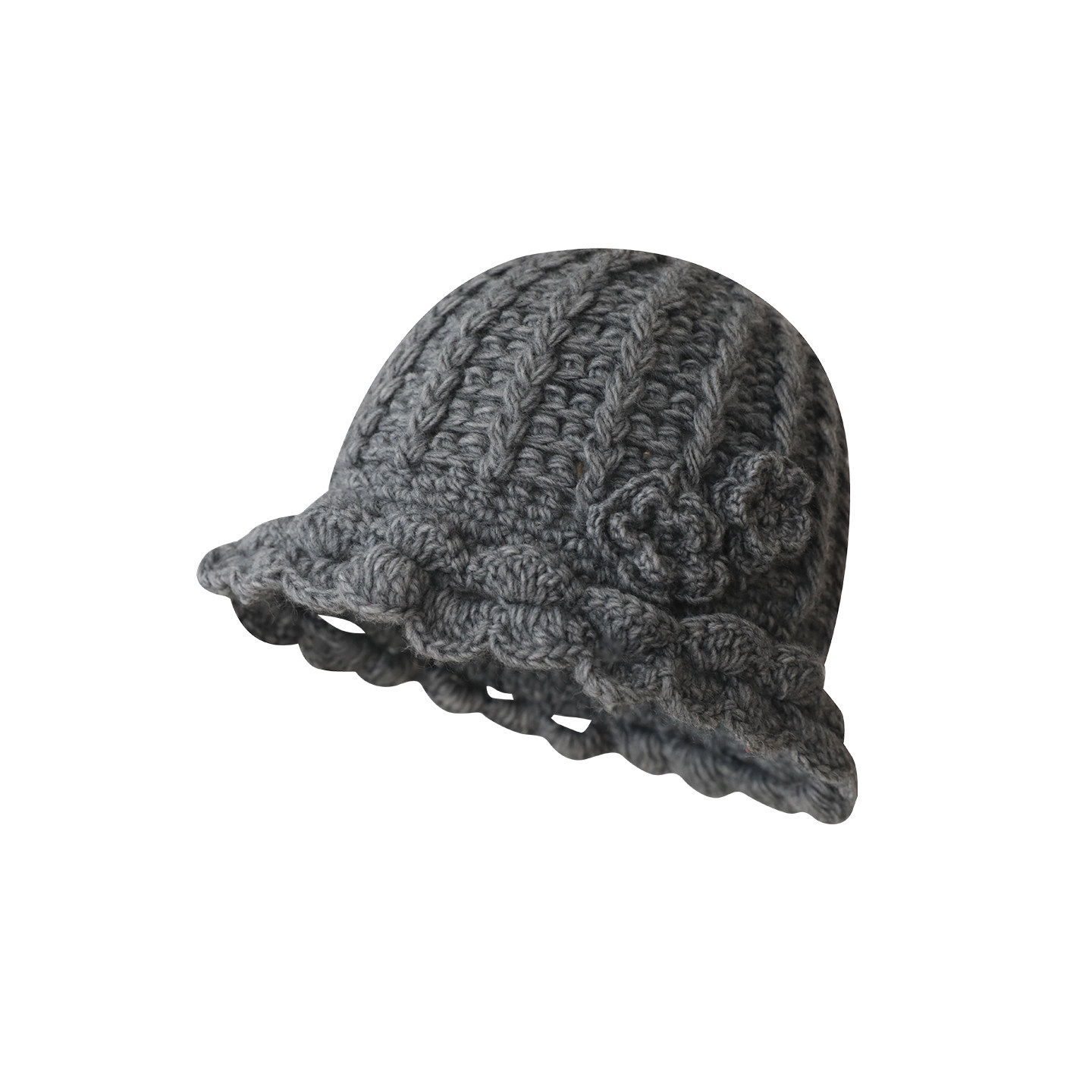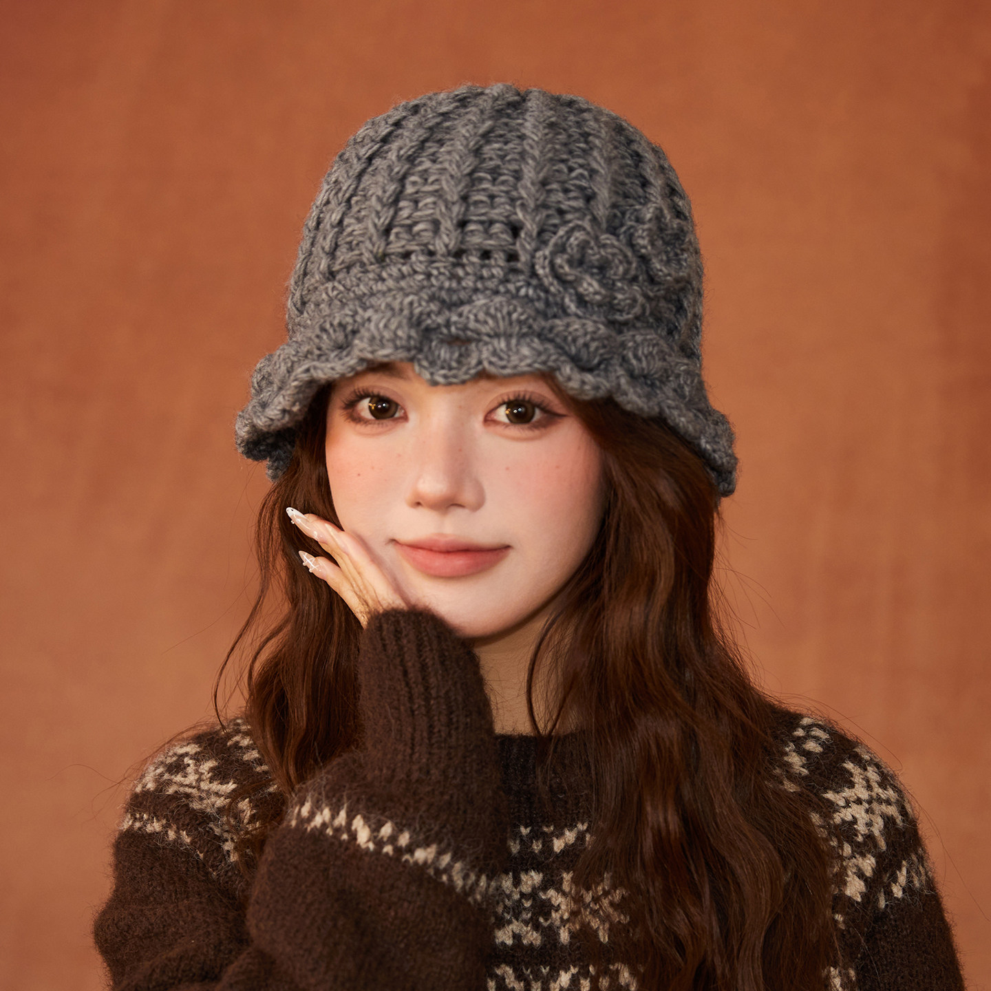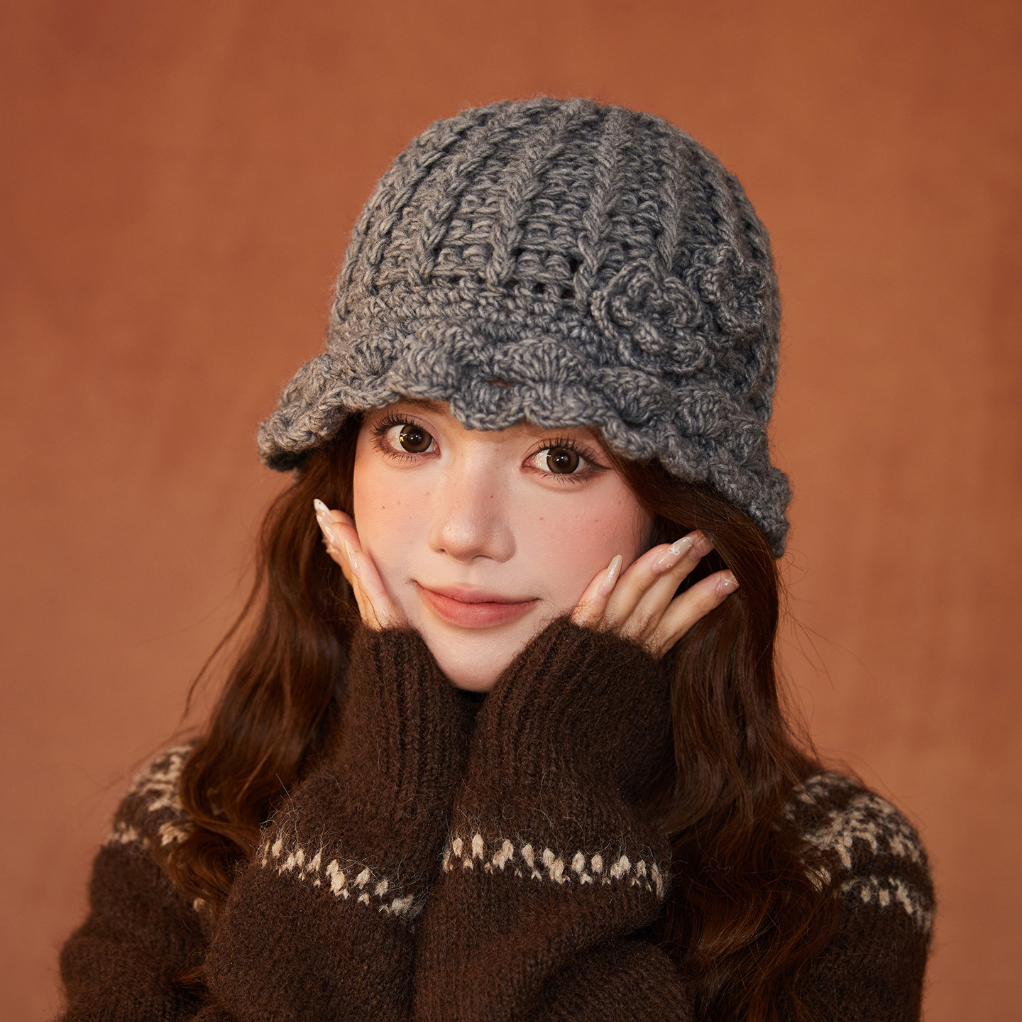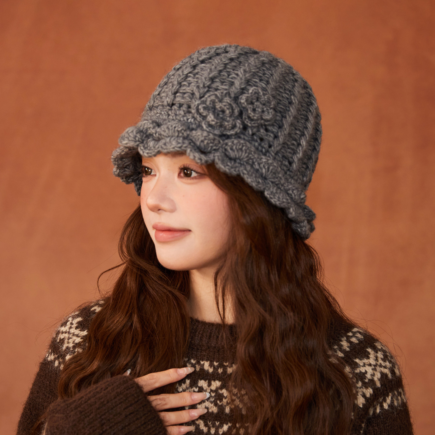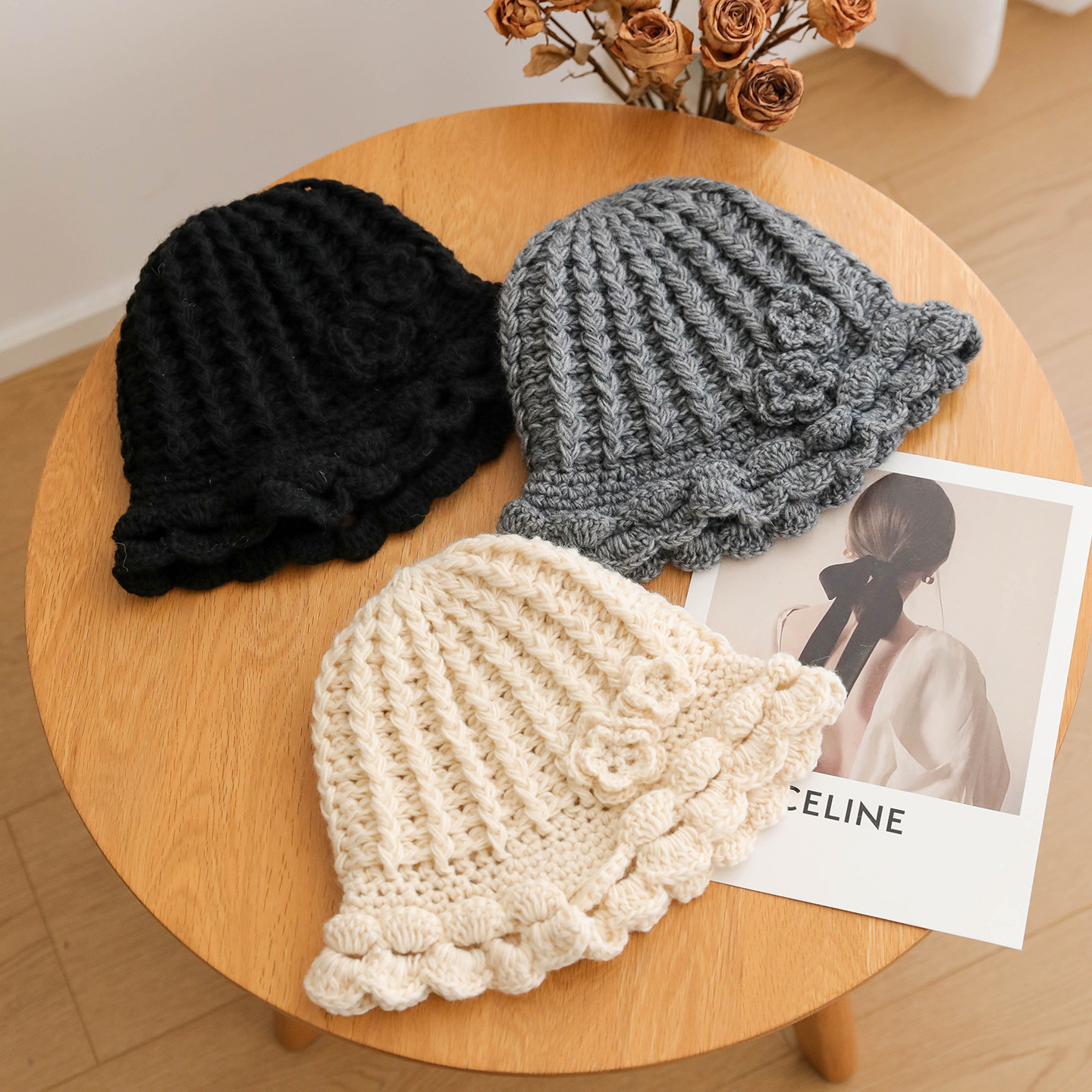 📚 手工钩织简约纯色盆帽立体花朵针织渔夫帽甜美双层花边圆顶毛线帽