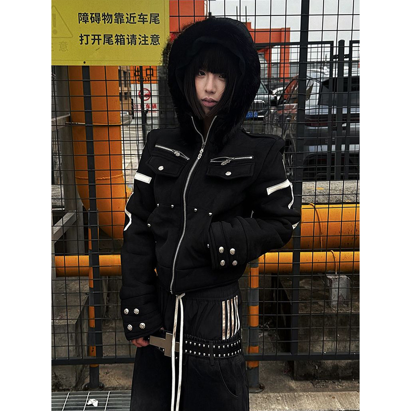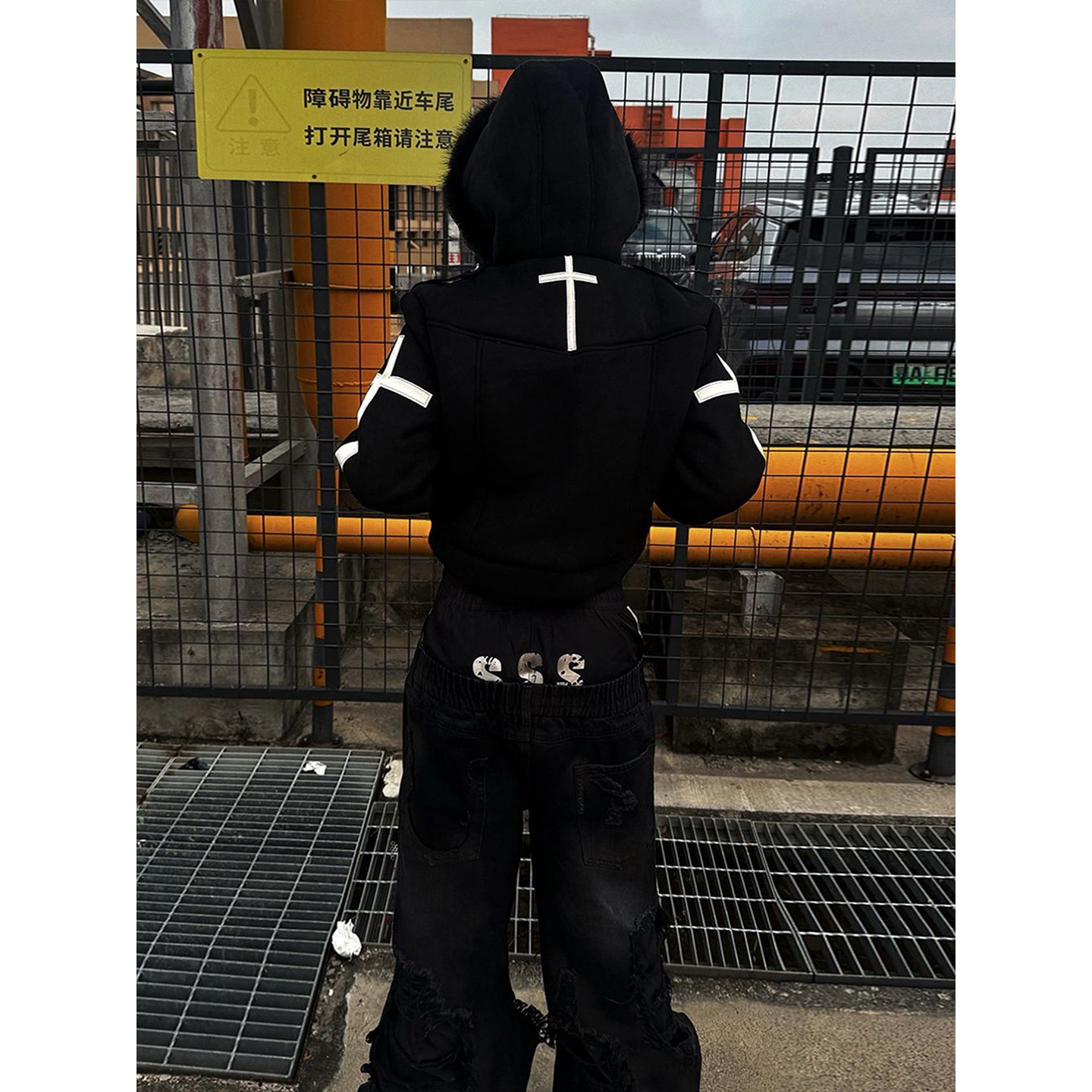 📚 亚文化麂皮外套女冬季新款十字架正肩短款黑色连帽棉服视觉系y2k