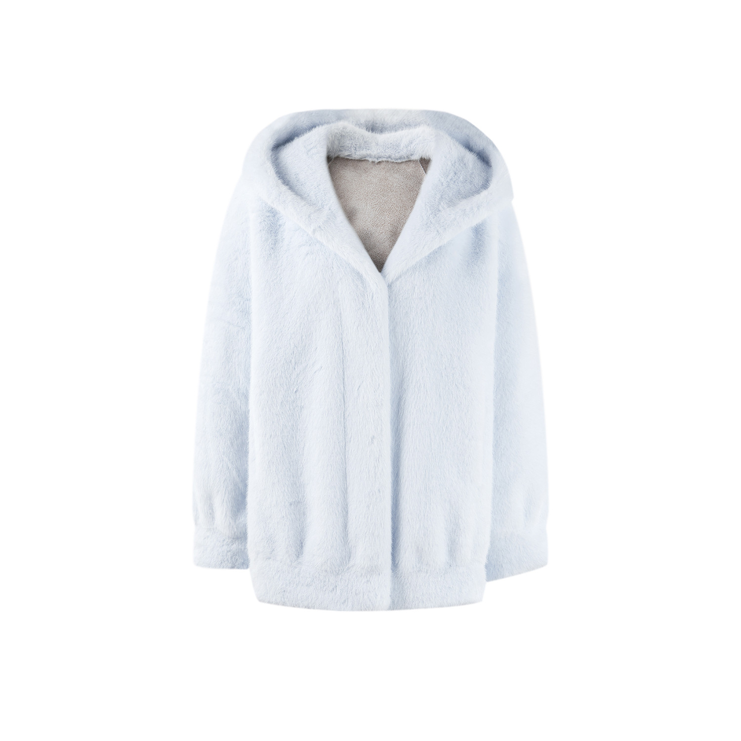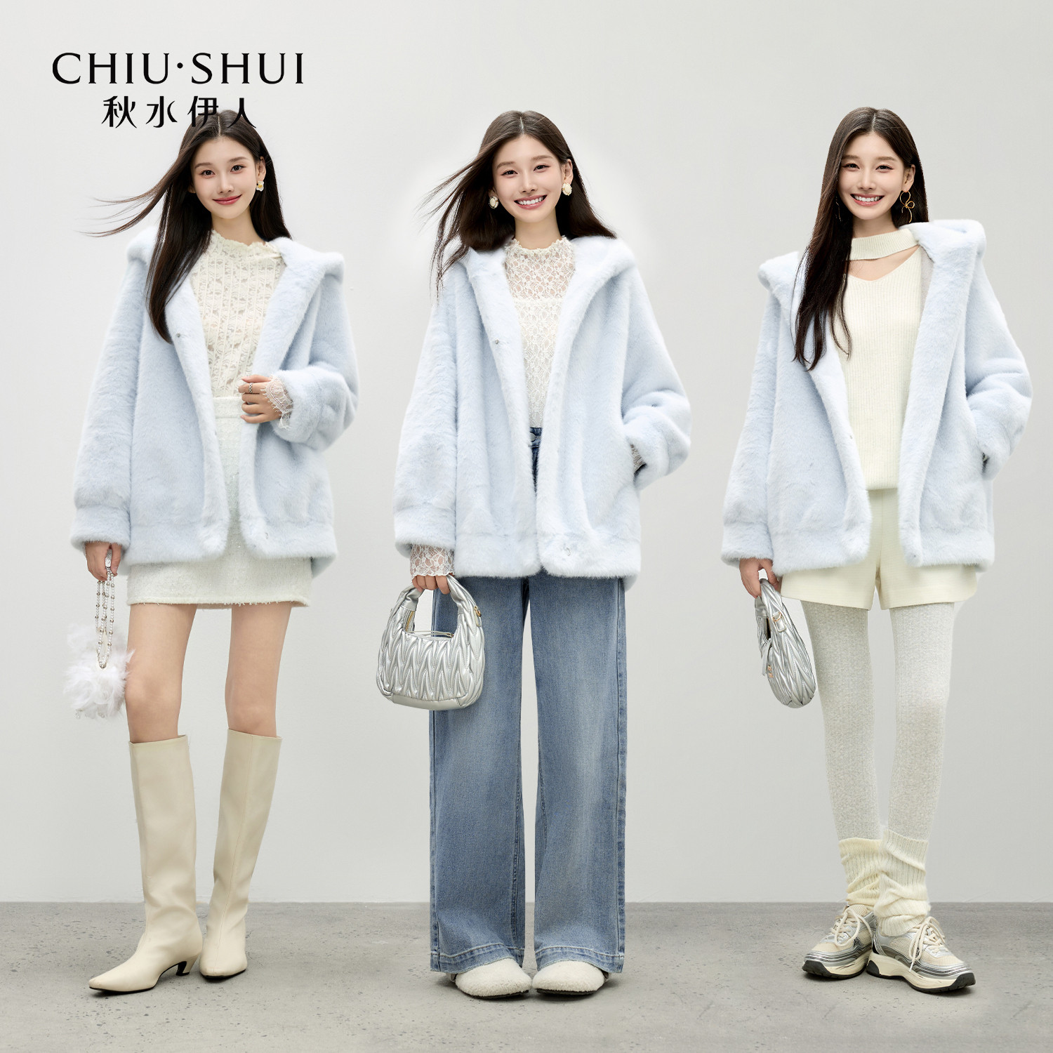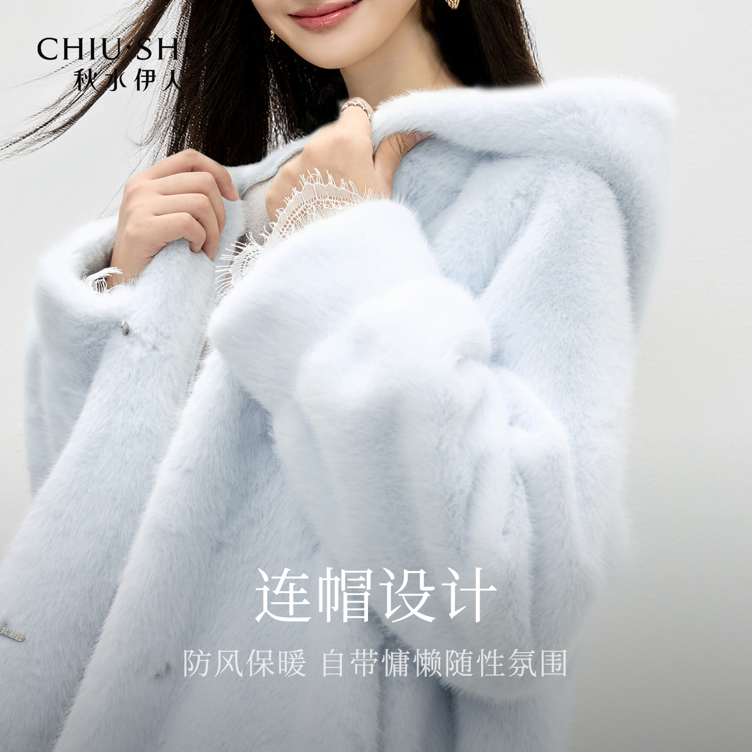 📚 秋水伊人蓝色环保皮草外套女2025年冬季新款休闲经典连帽时尚上衣