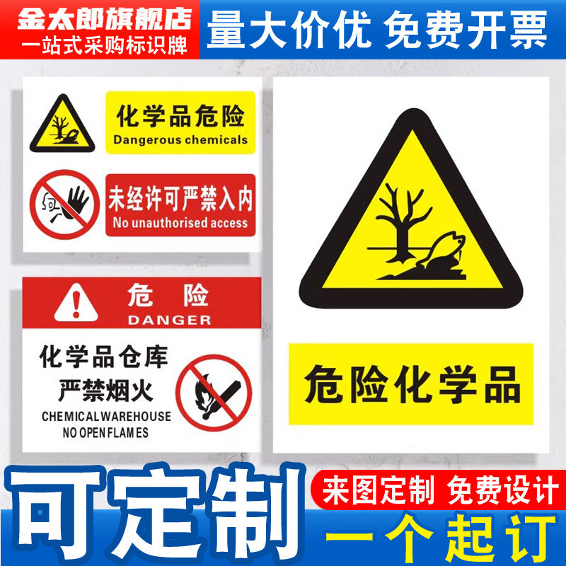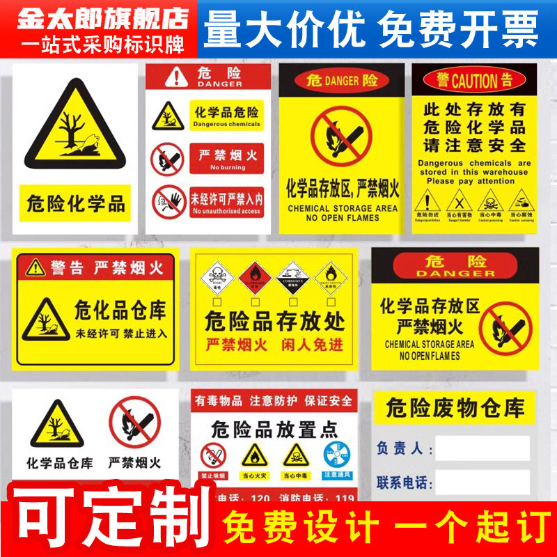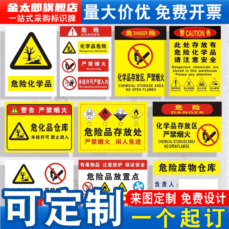 📚 此处存放有危险化学品仓库严禁烟火请注意安全存放区储存区贮储地未经许可严禁入内剧毒品易制爆标识警示牌贴