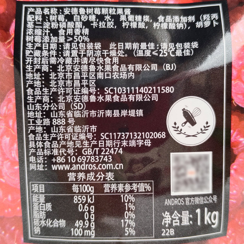 📚 安德鲁树莓颗粒果酱1KG 覆盆子桑子果粒果泥果蓉冰沙饮料奶茶饮品