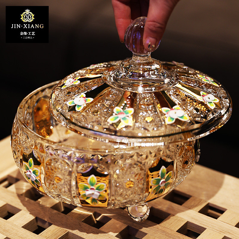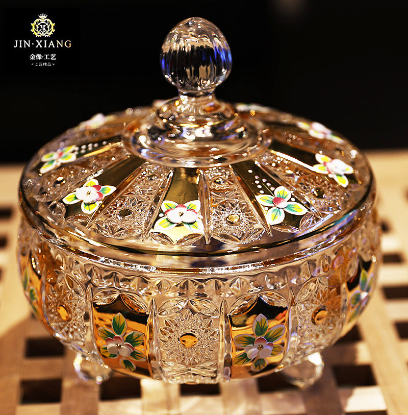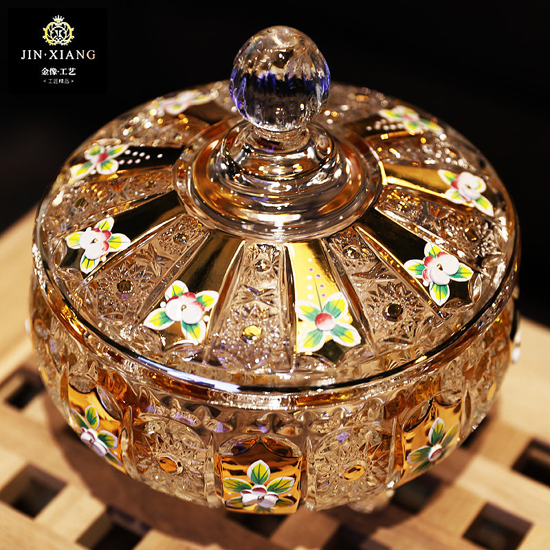 📚 捷克珐琅镀金工艺水晶玻璃糖缸干果零食糖果盒带盖果盅果斗果盘
