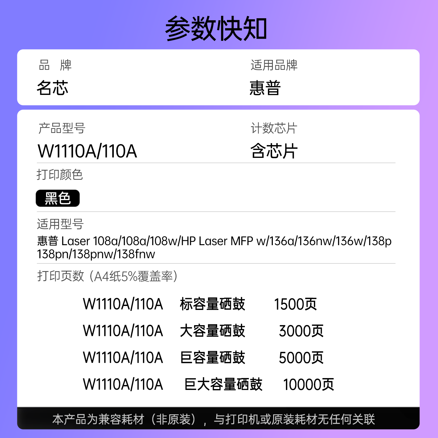 📚 名芯适用惠普W1110硒鼓HP Laser 108a/108w/HP Laser MFP激光打印机136nw/138p/138pn/138pnw/138fnw粉盒