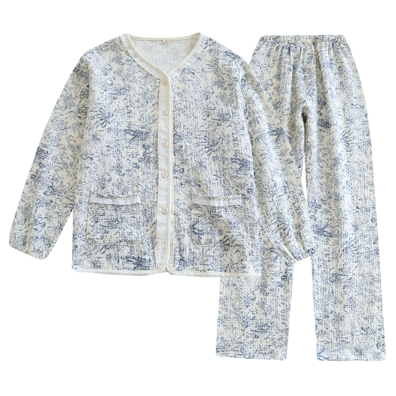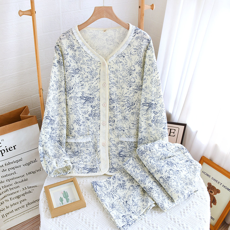 📚 田园女睡衣纯棉绉布收口开衫花边V领长袖春秋夏季薄款长裤空调服