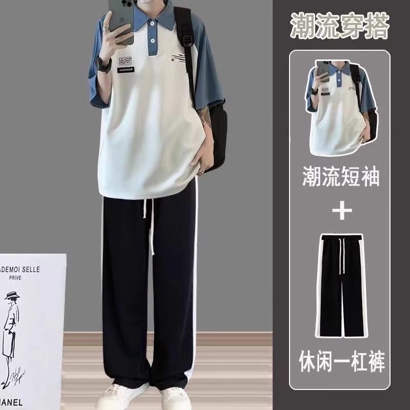 📚 男装一套搭配日系polo衫短袖t恤男套装夏季潮牌青少年学院风宽松