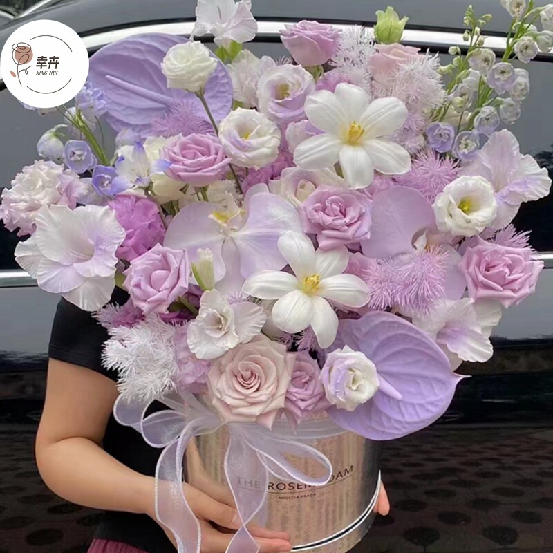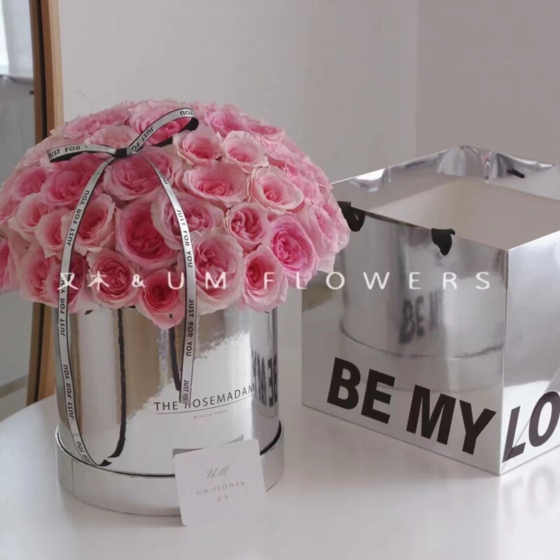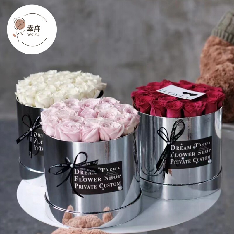 📚 新款银色套二圆形抱抱桶鲜花包装盒金属质感花盒永生花艺插花纸盒