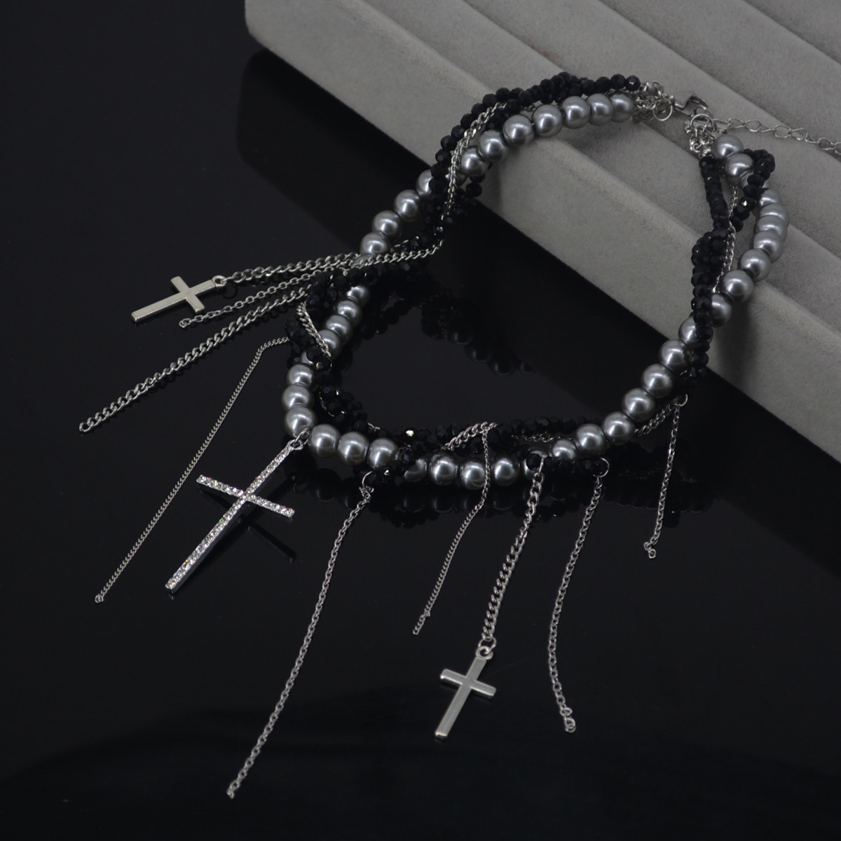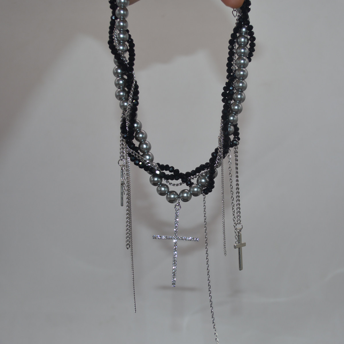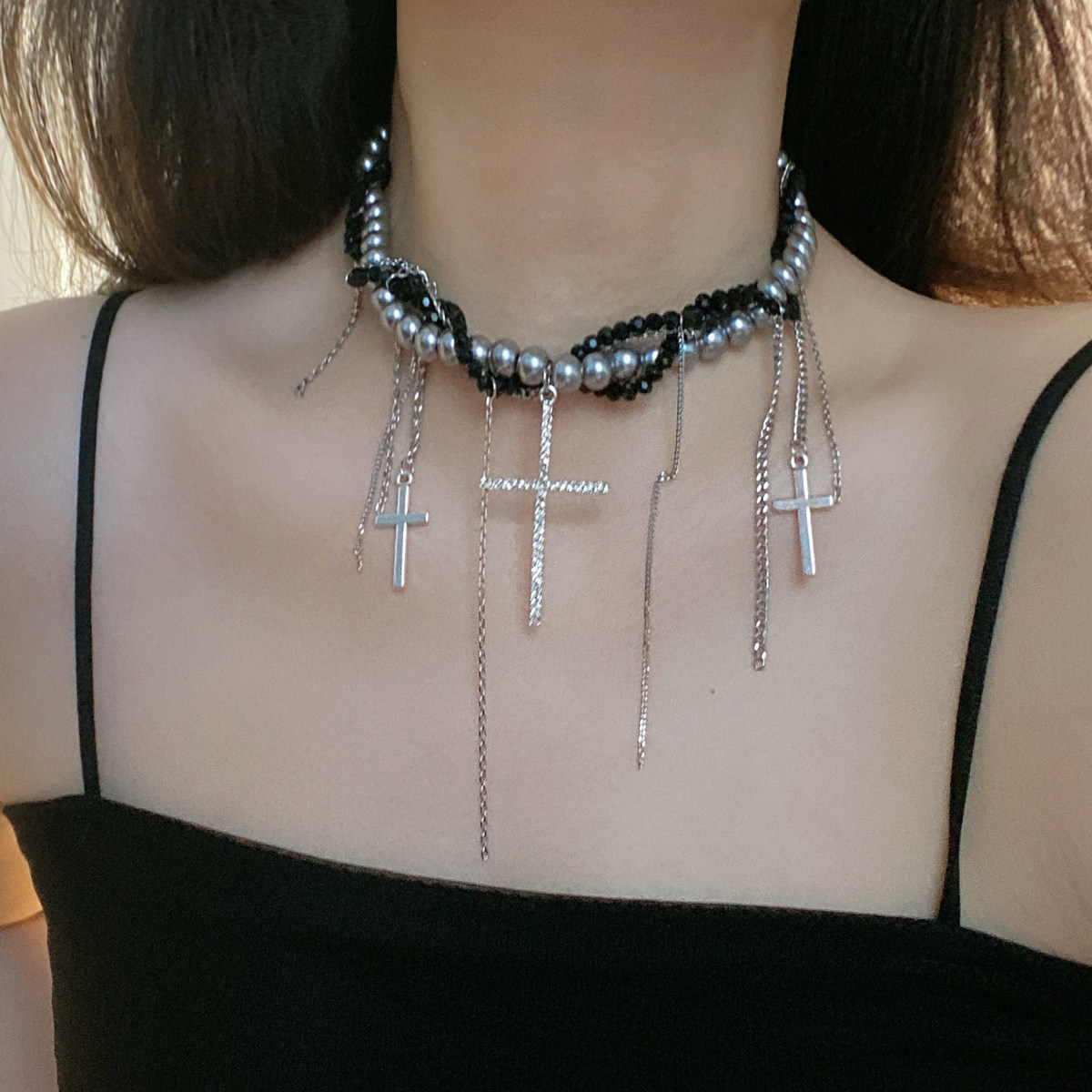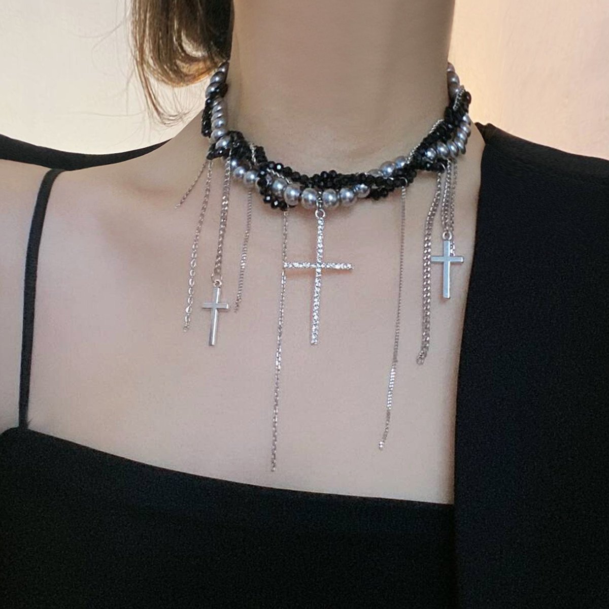 📚 水晶缠绕链条流苏镶钻十字架项链女甜酷辣妹风珍珠多层颈链锁骨链