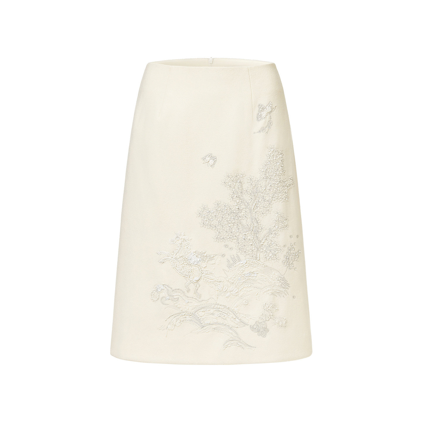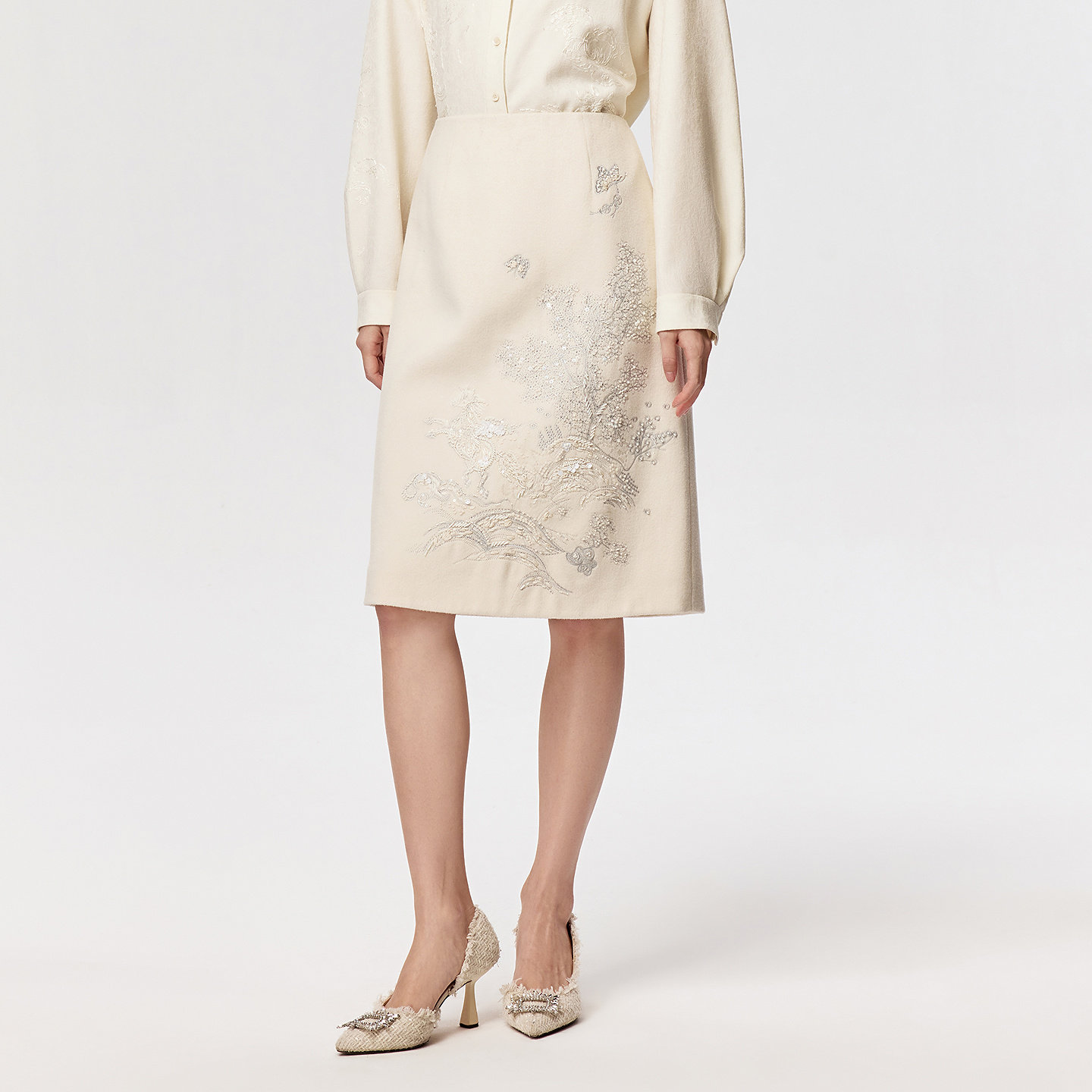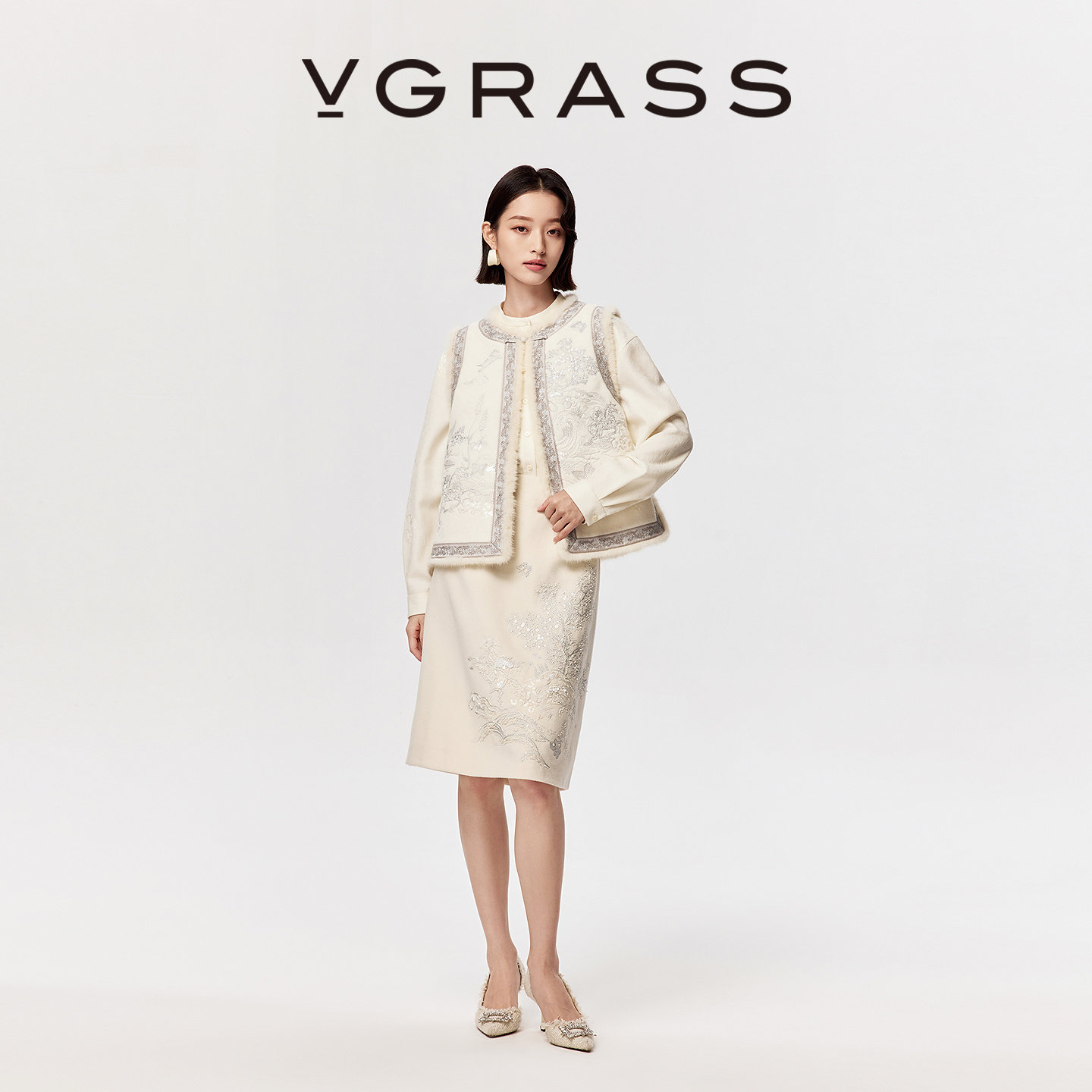 📚 【马上有戏】VGRASS26早春新款定位绣花斜纹呢优雅气质白色半身裙