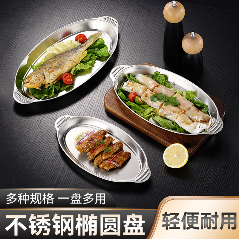 📚 食品级304不锈钢蒸鱼盘双耳家用椭圆形清蒸鱼盘子专用蒸鲈鱼碟