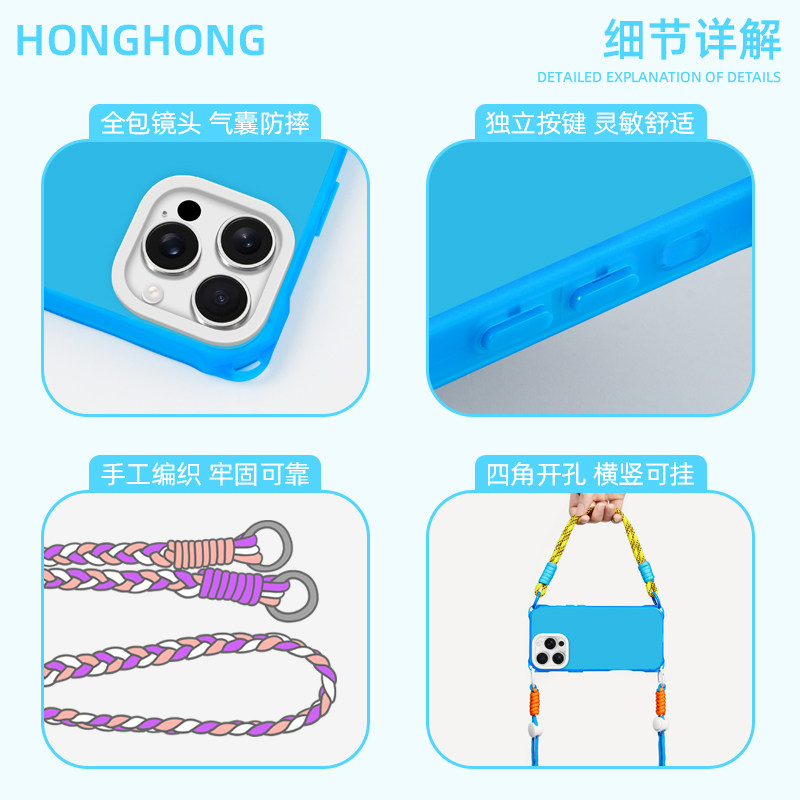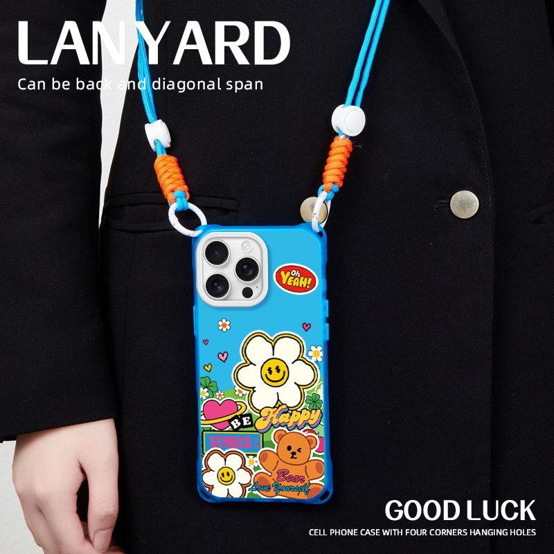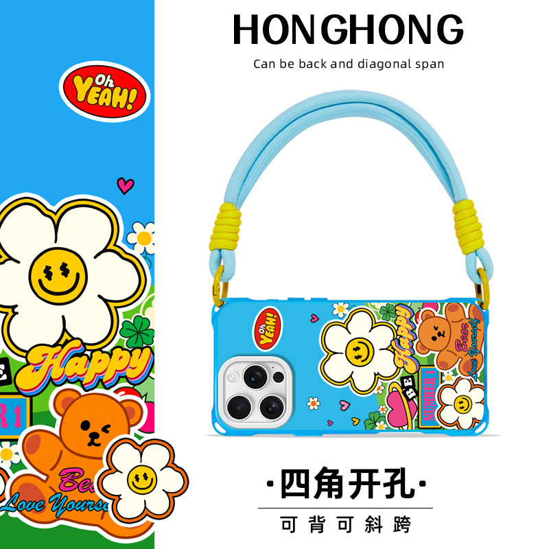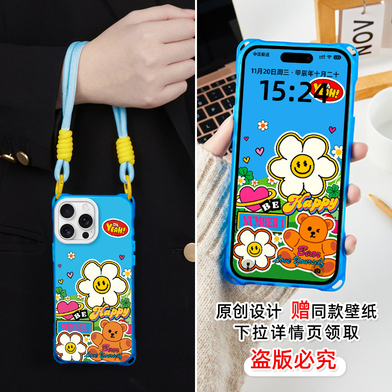 📚 原创开心花蓝适用苹果14promax华为mate60手机壳挂绳13pro斜挎手提iphone16plus卡通支架pura70ultra磁吸新款