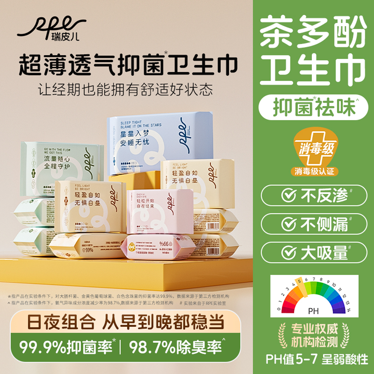 📚 RPE瑞皮儿卫生巾茶多酚抑菌超薄防漏官方消毒医护日夜组合姨妈巾