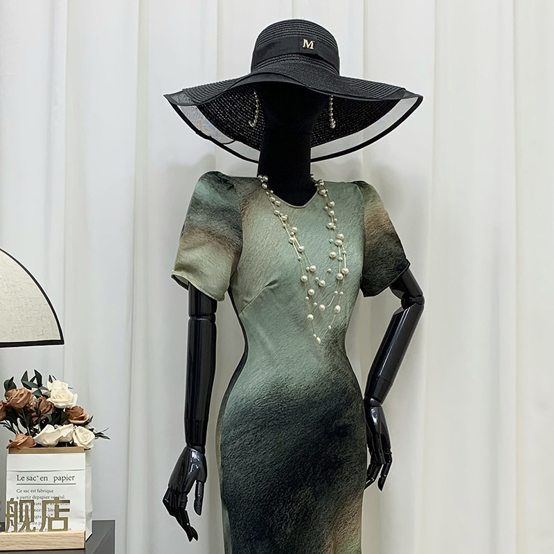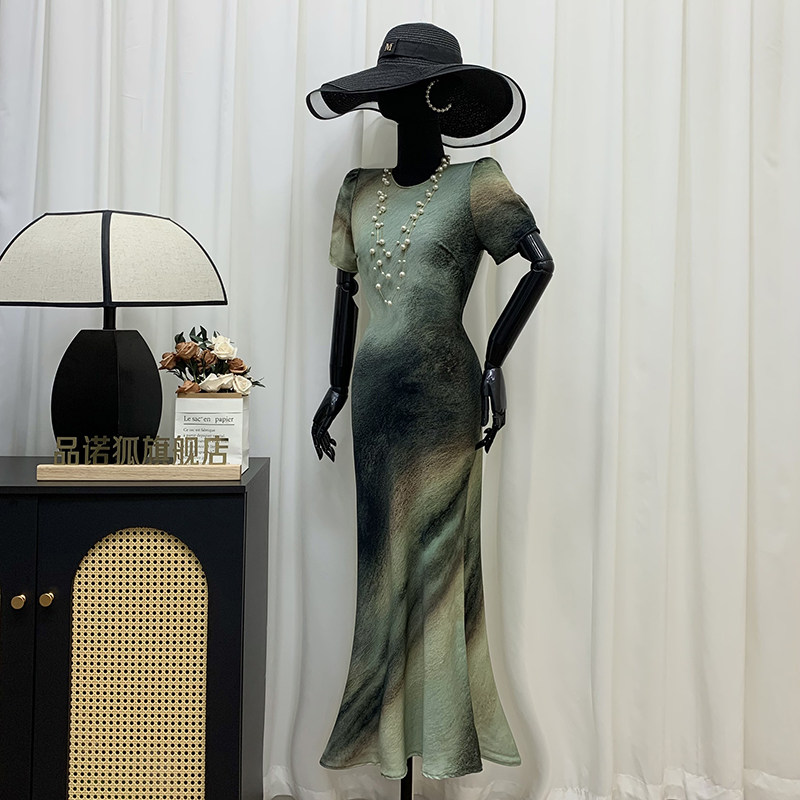 📚 品诺狐2025夏季丹青水墨画雪纺连衣裙新中式国风圆领短袖包臀长裙