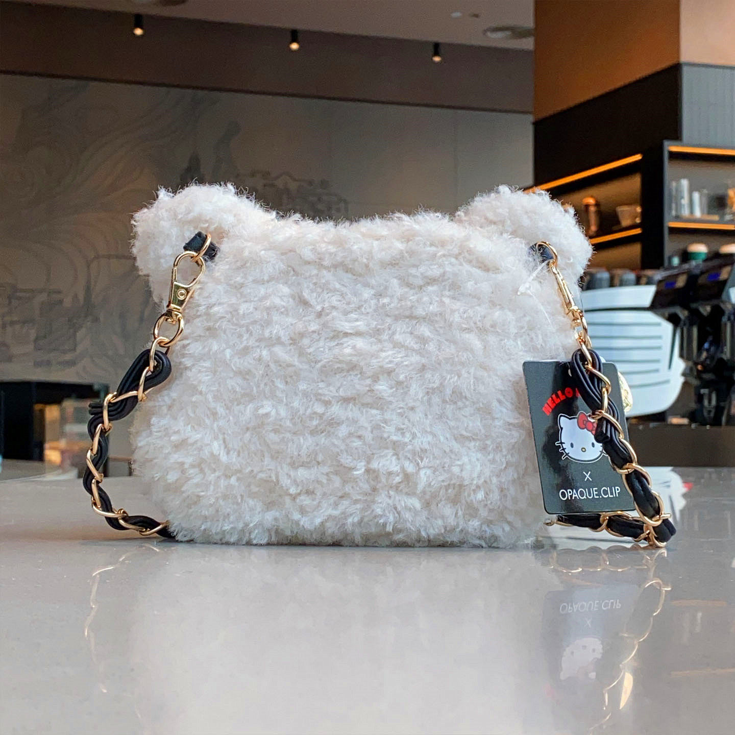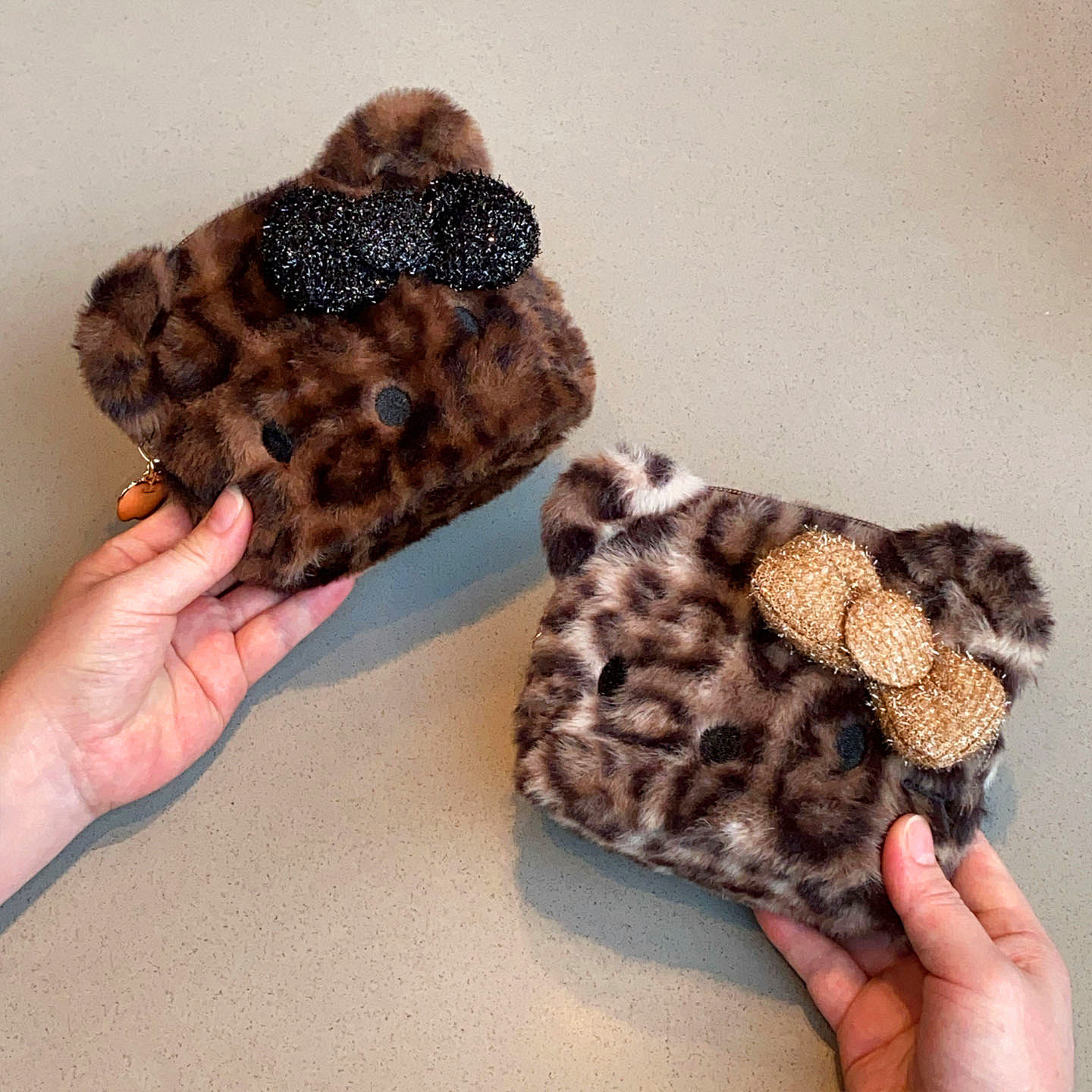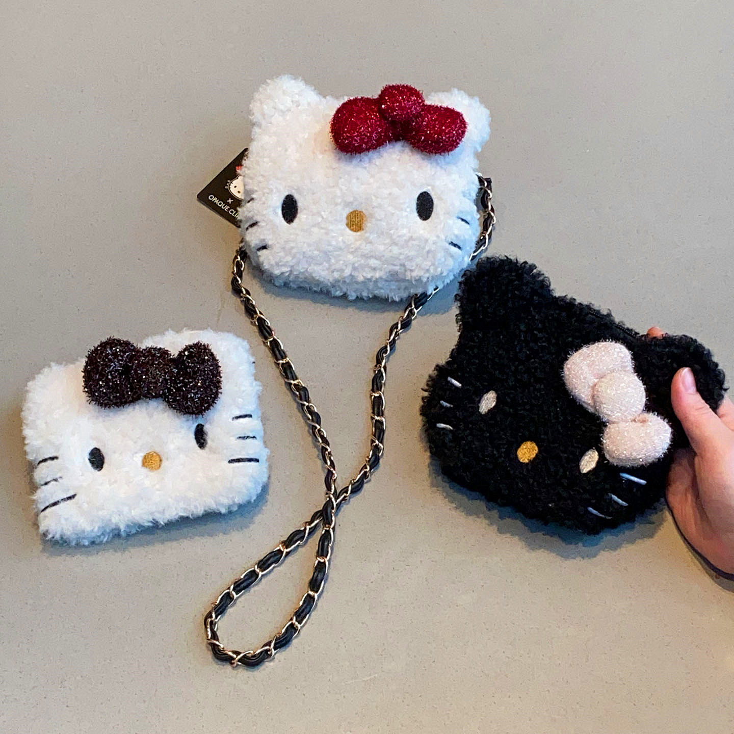 📚 日系卡通猫咪可爱蝴蝶结毛绒刺绣包化妆品零钱收纳包一字包斜跨包