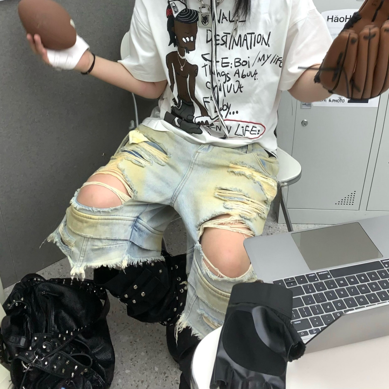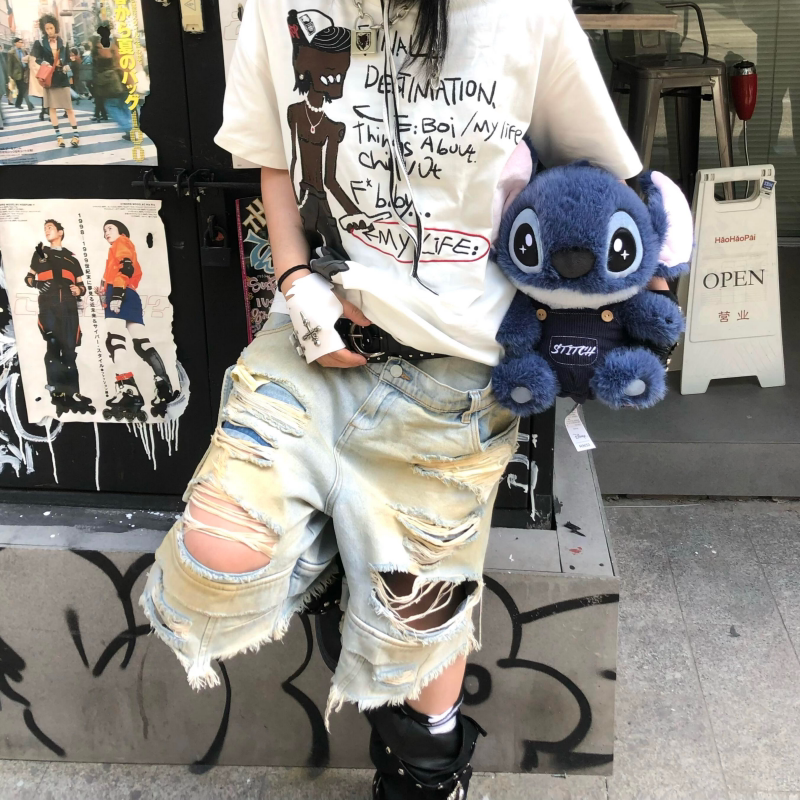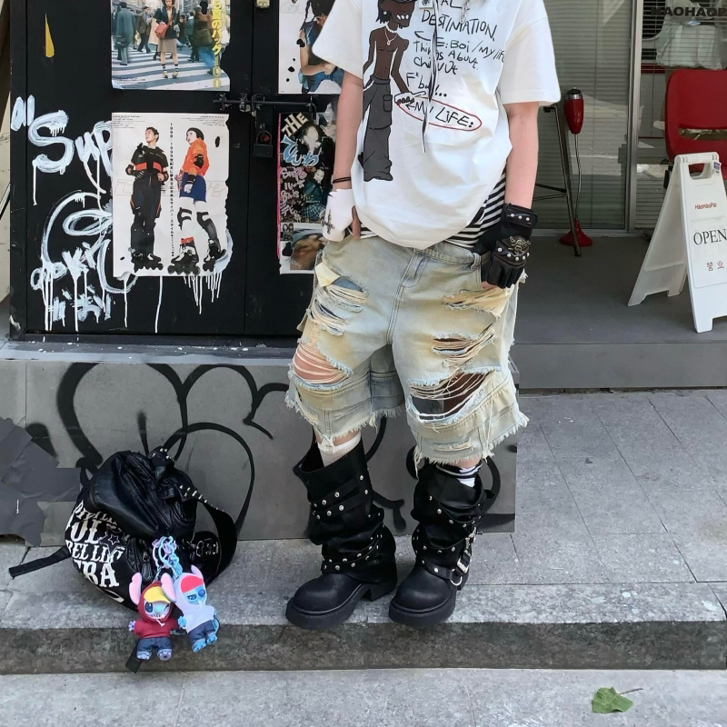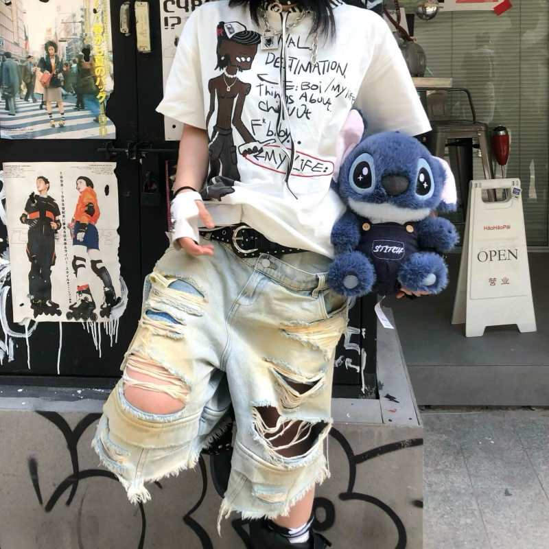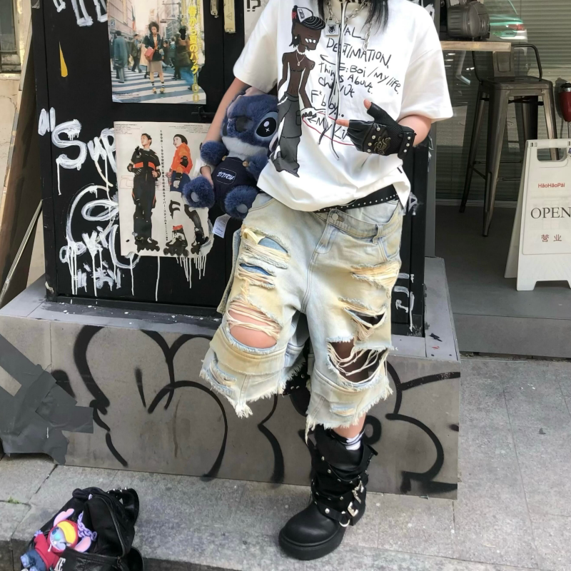 📚 Start美式街头双腰黄泥破洞工装七分牛仔裤男小众设计感宽松短裤