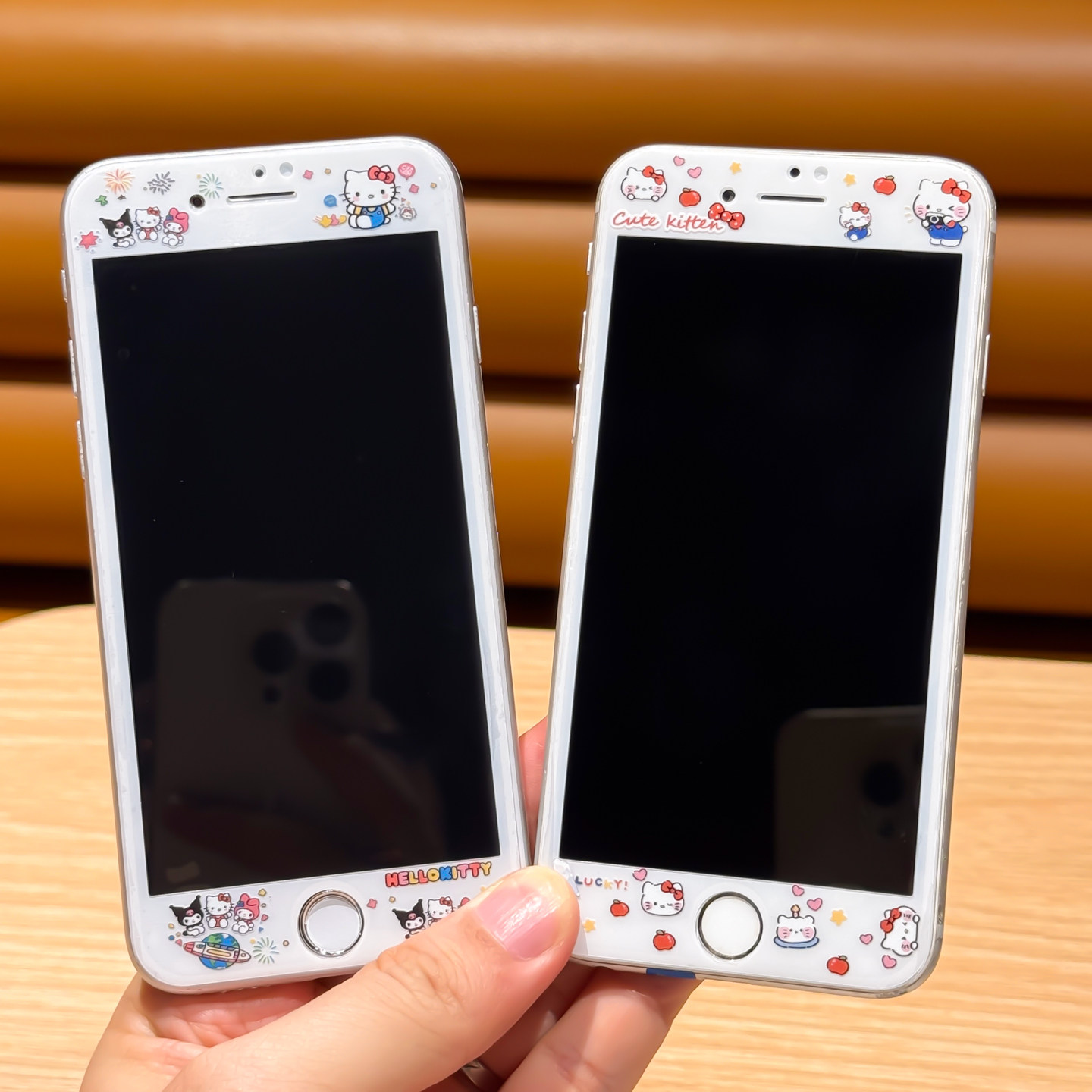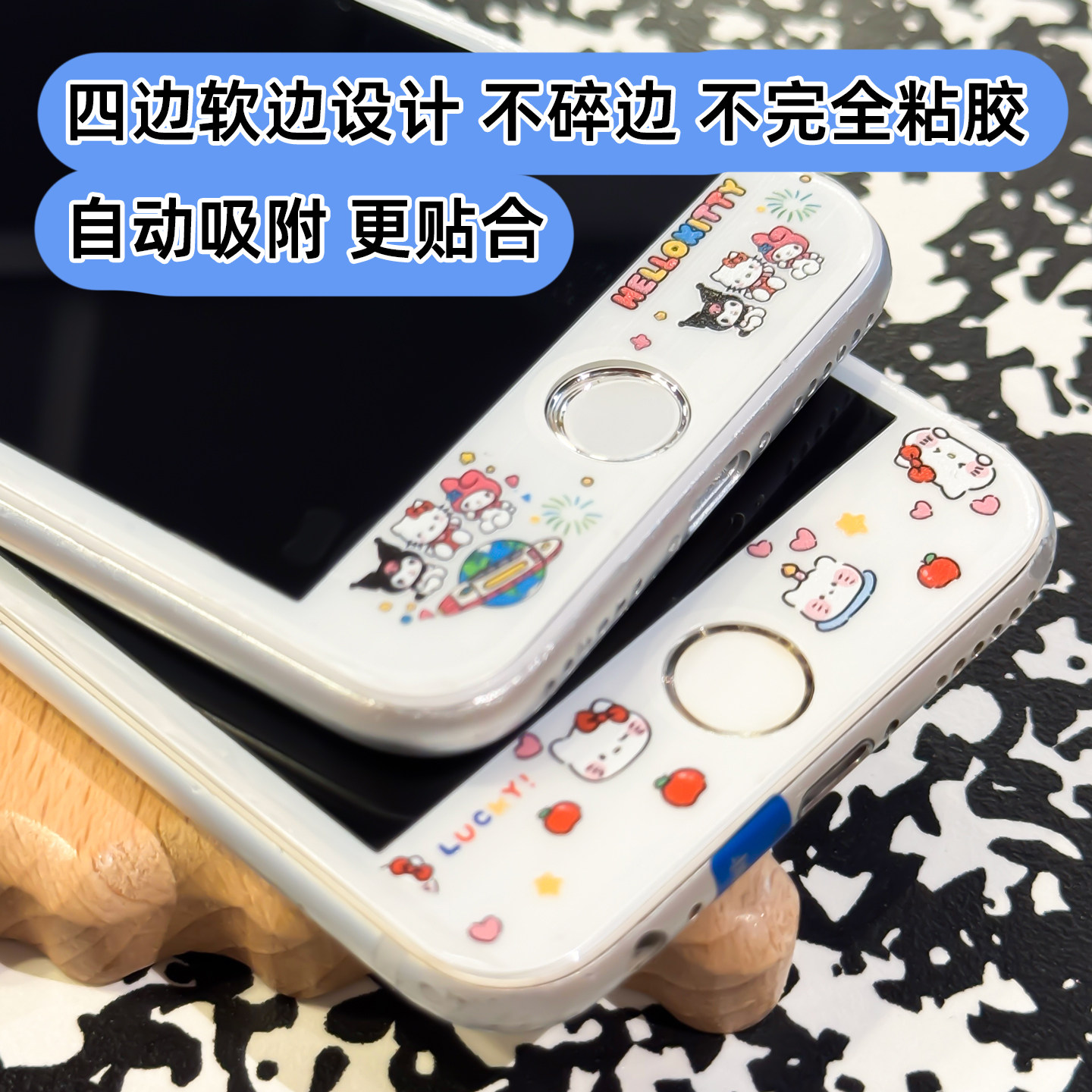 📚 新款凯蒂猫kitty适用苹果6s/7/8卡通钢化玻璃贴膜iPhone7/8plus全屏彩色软边前膜SE1/2/3女款4/5S美乐蒂6plus