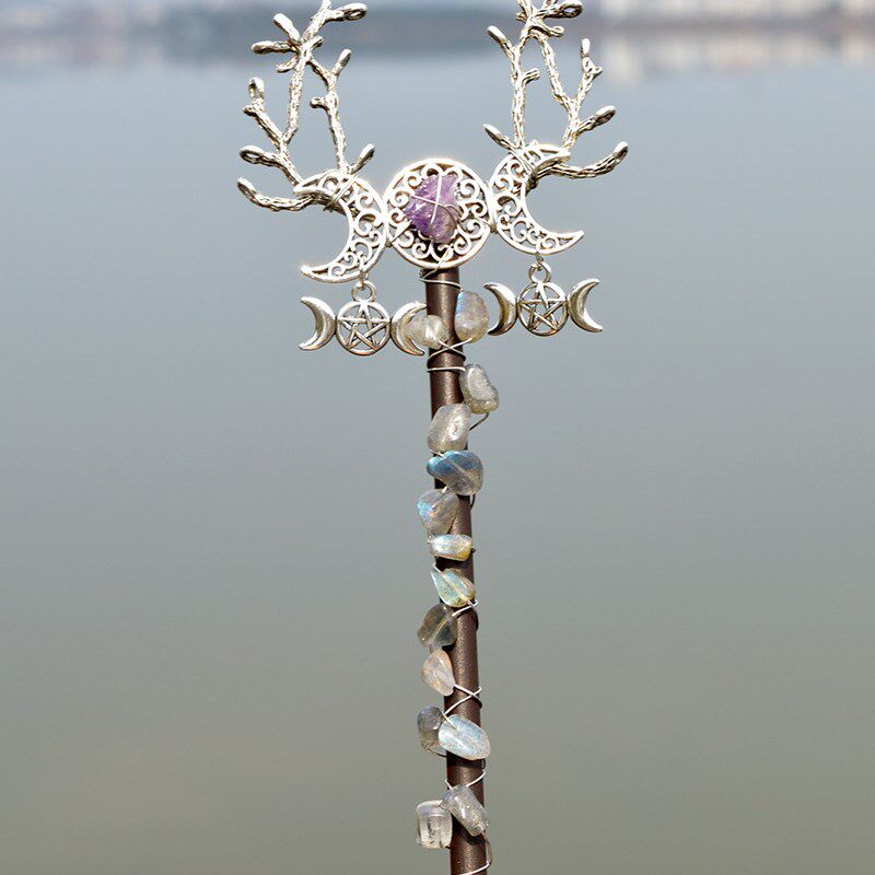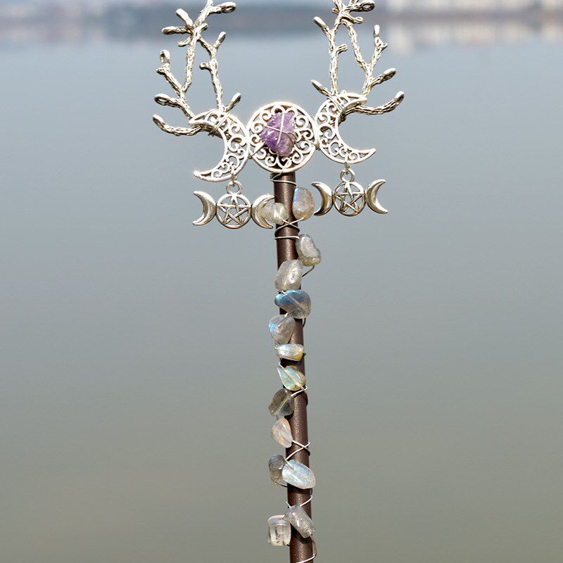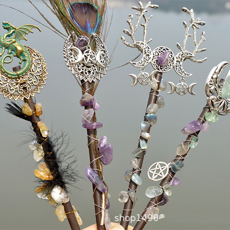 📚 18厘米长紫水晶月亮维京龙羽毛手工权杖仙女棒天然水晶碎石女巫