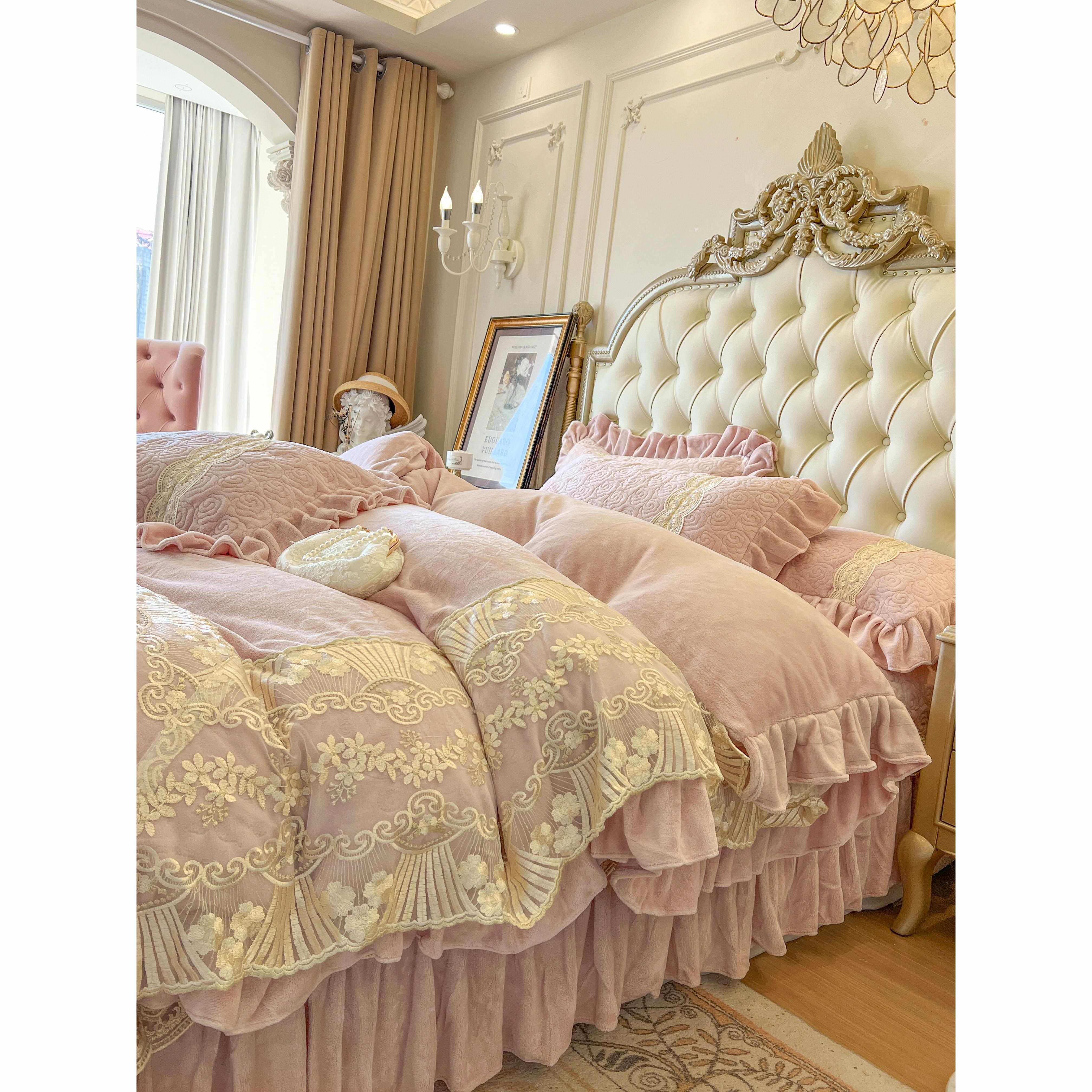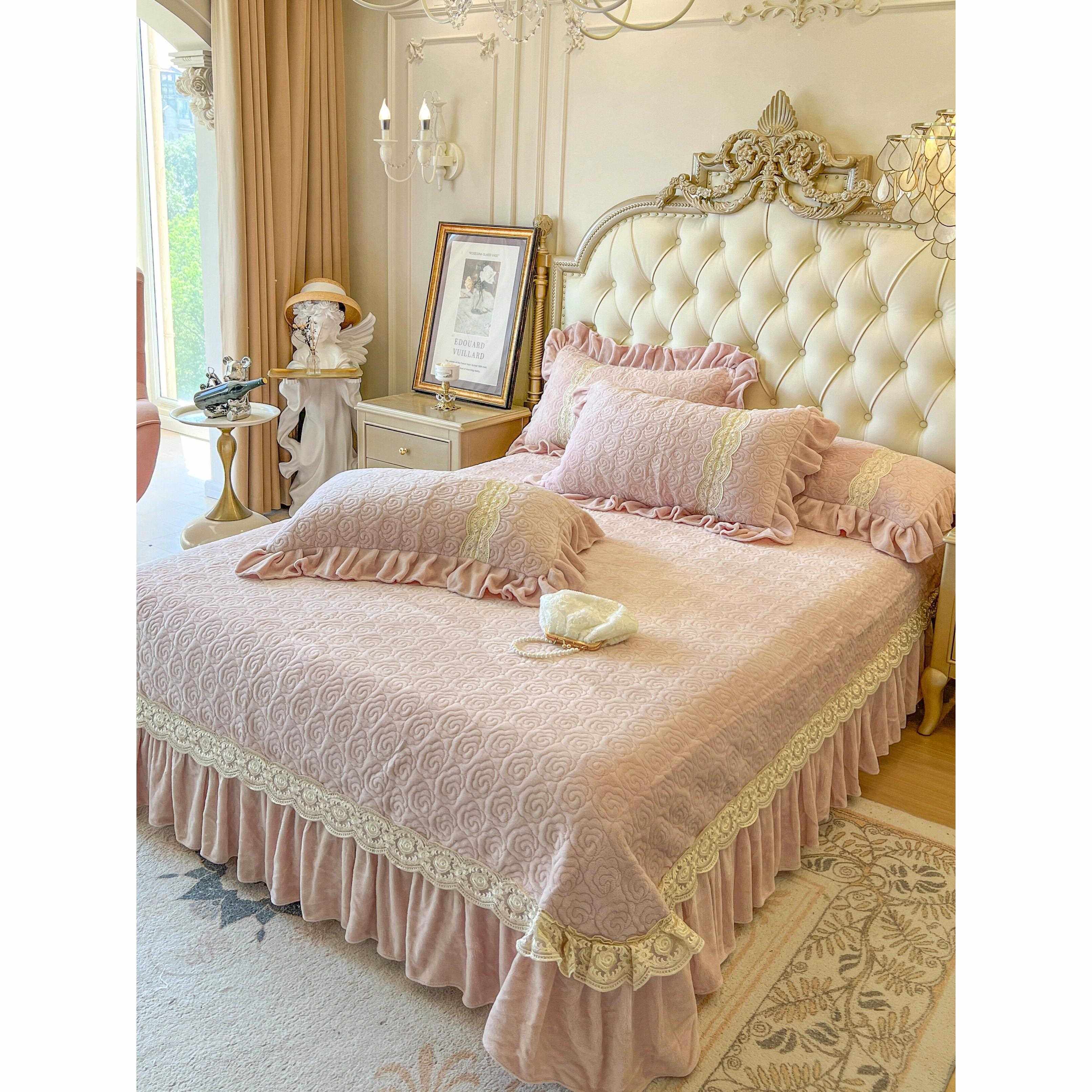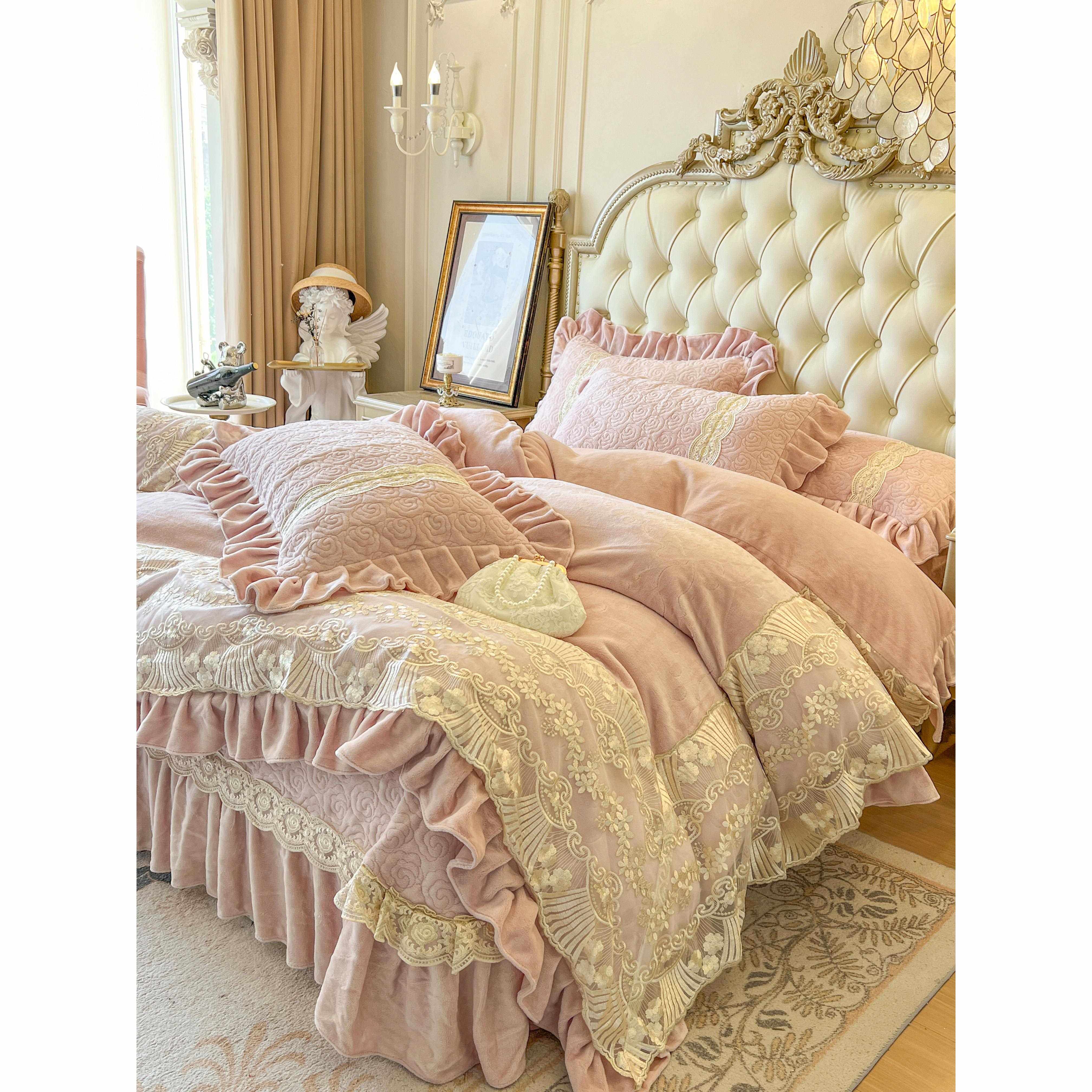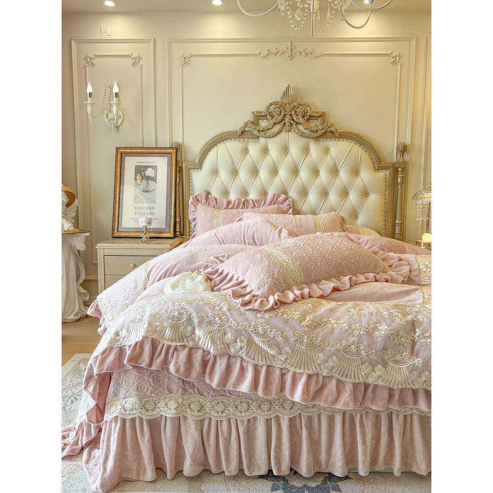 📚 冬季雕花奶床上四件套公主风双珊瑚绒绒蕾丝花边被套牛加UTZ厚面