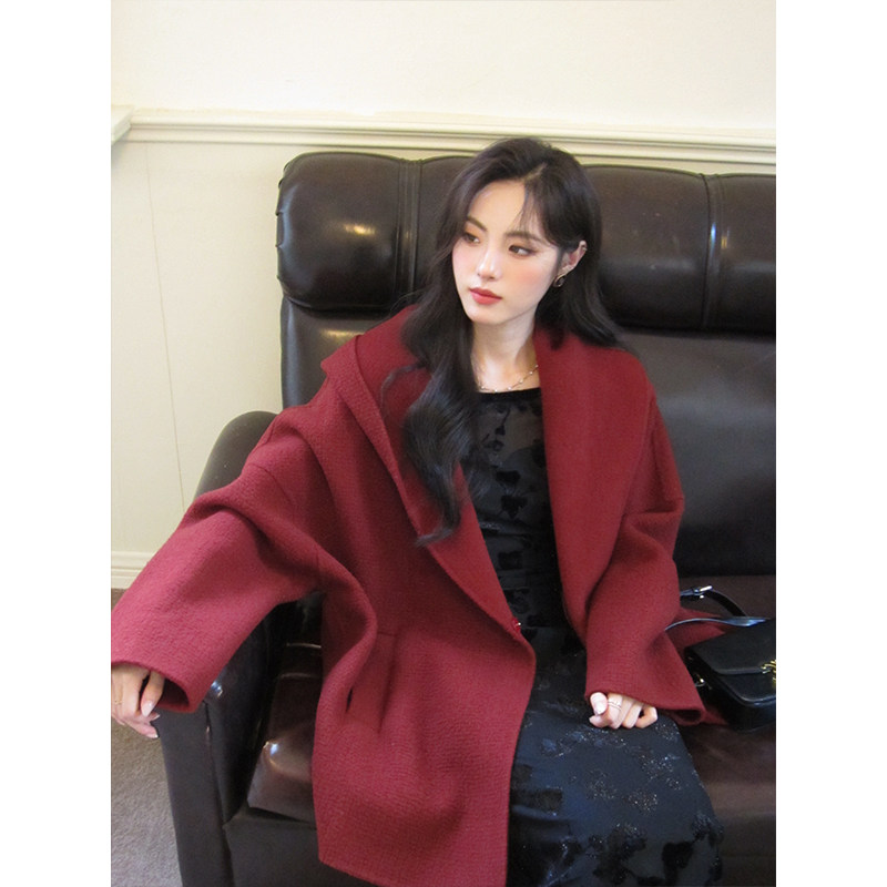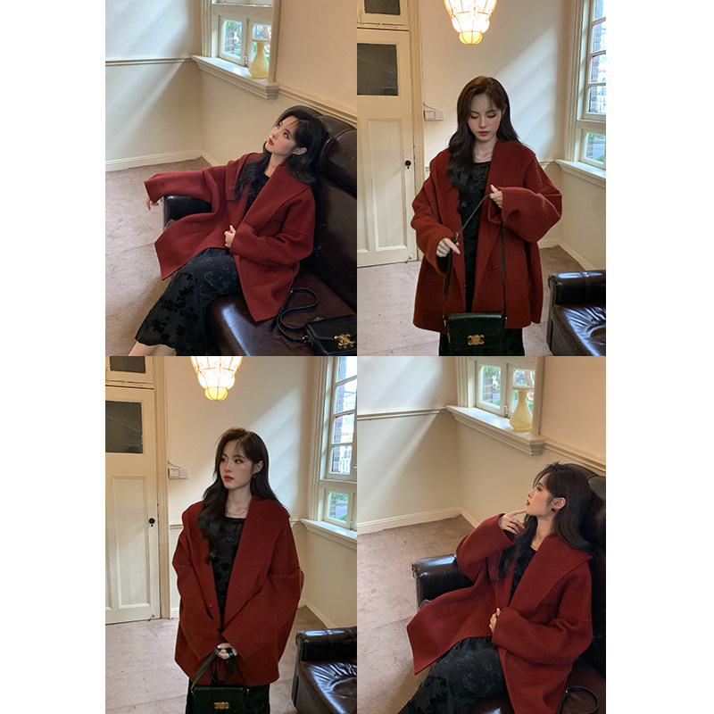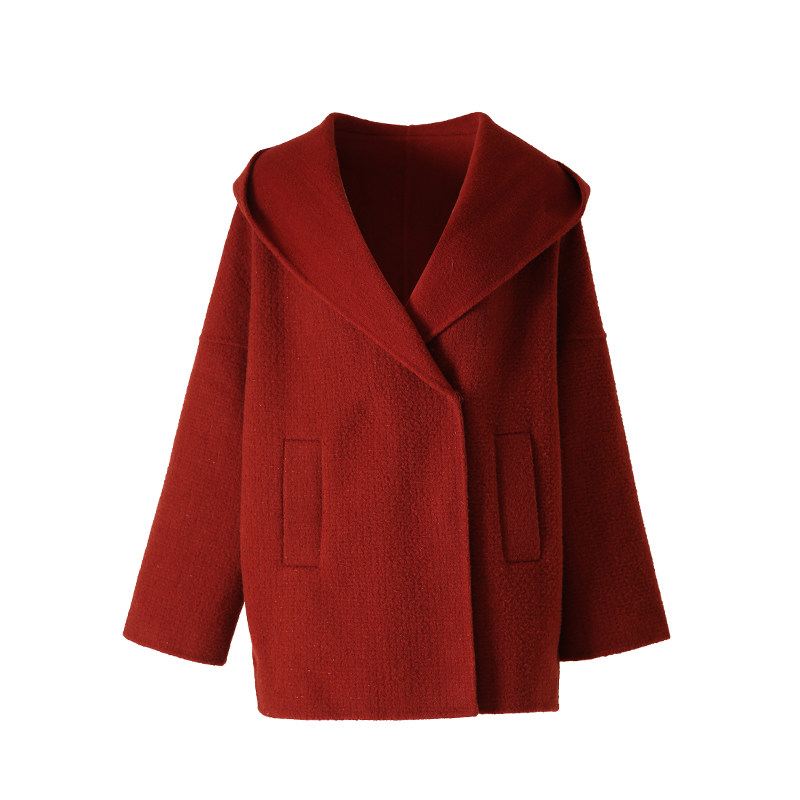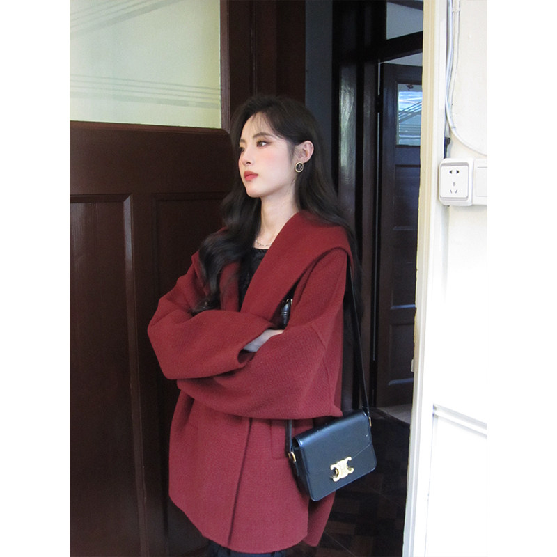 📚 ZHUYIYI 红色连帽双面羊绒大衣女春秋2025新款短款羊毛毛呢外套