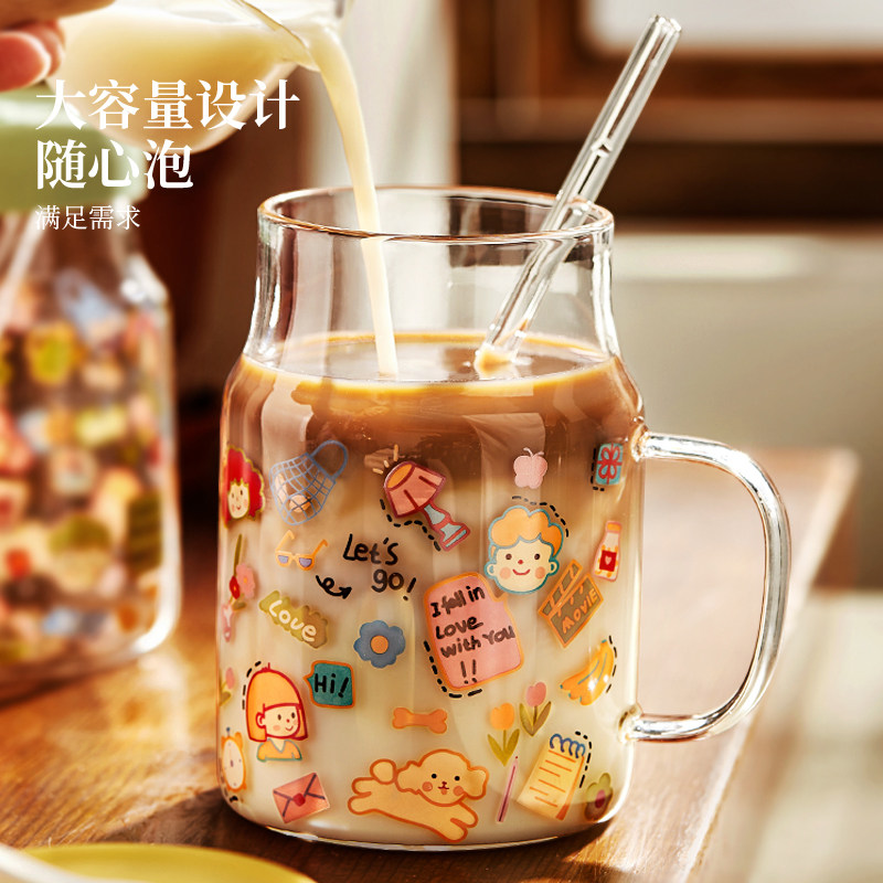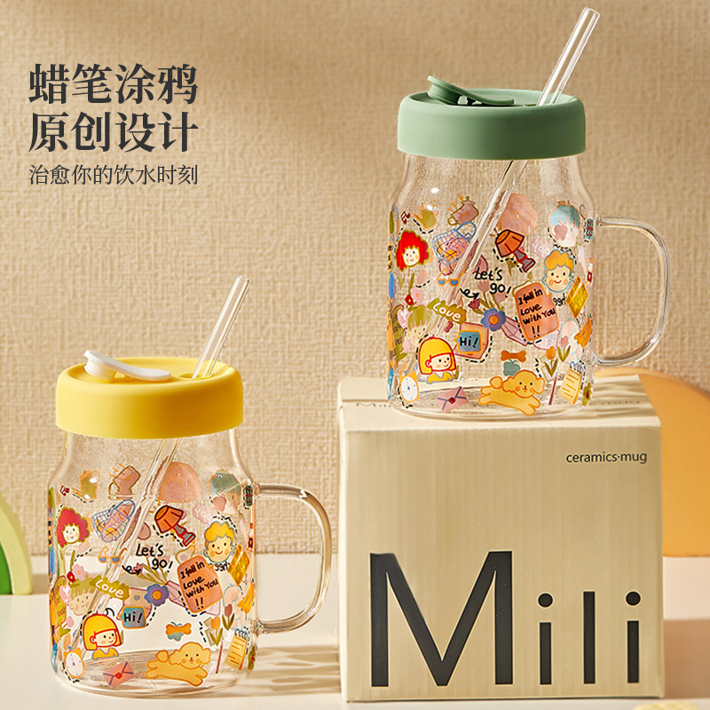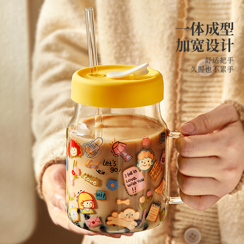 📚 高硼硅玻璃吸管杯女生高颜值办公室杯子带盖把手大容量水杯耐高温