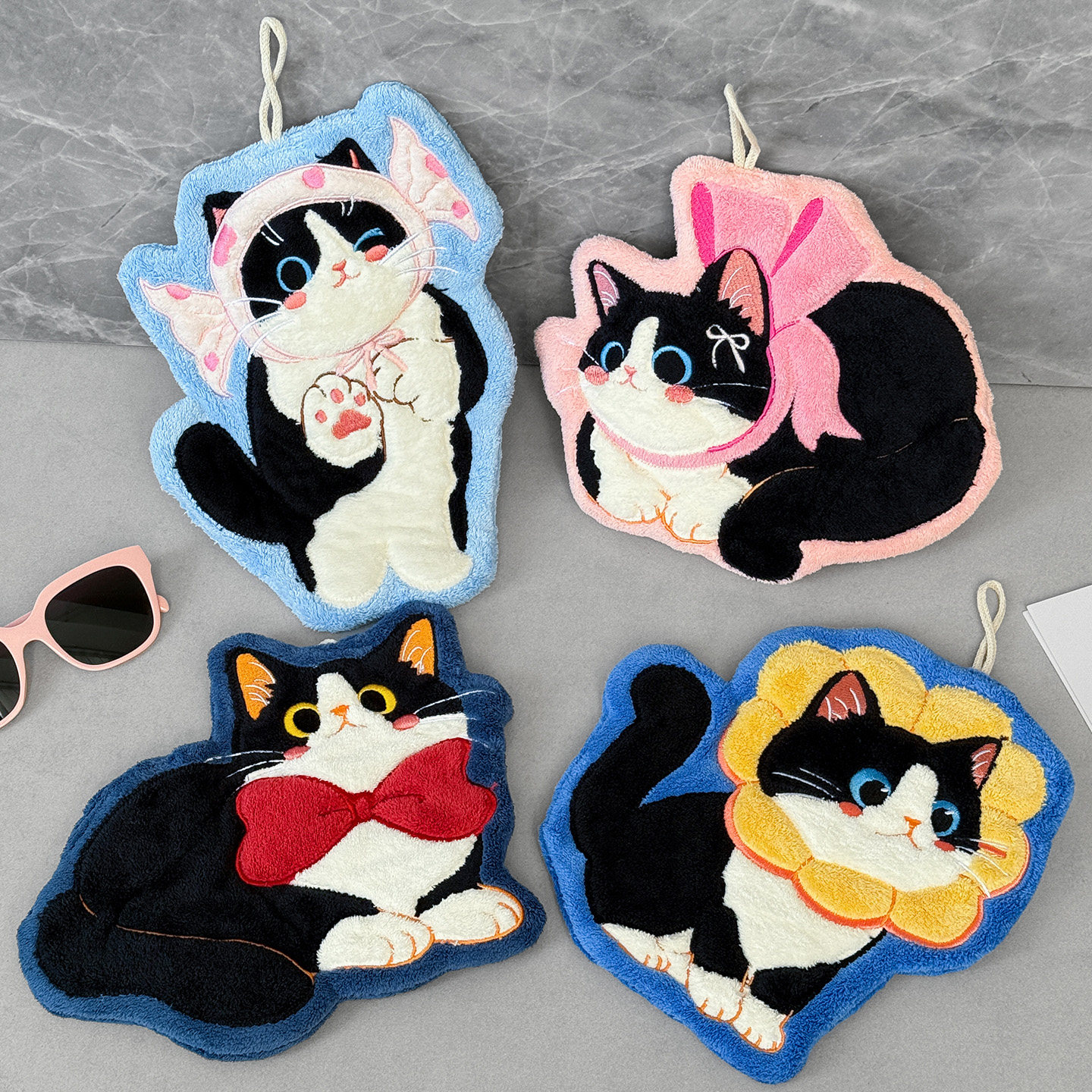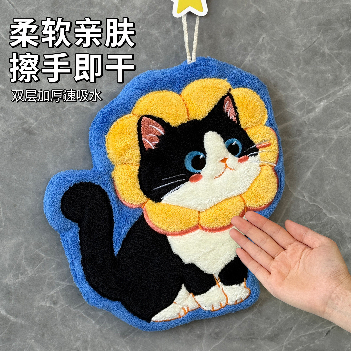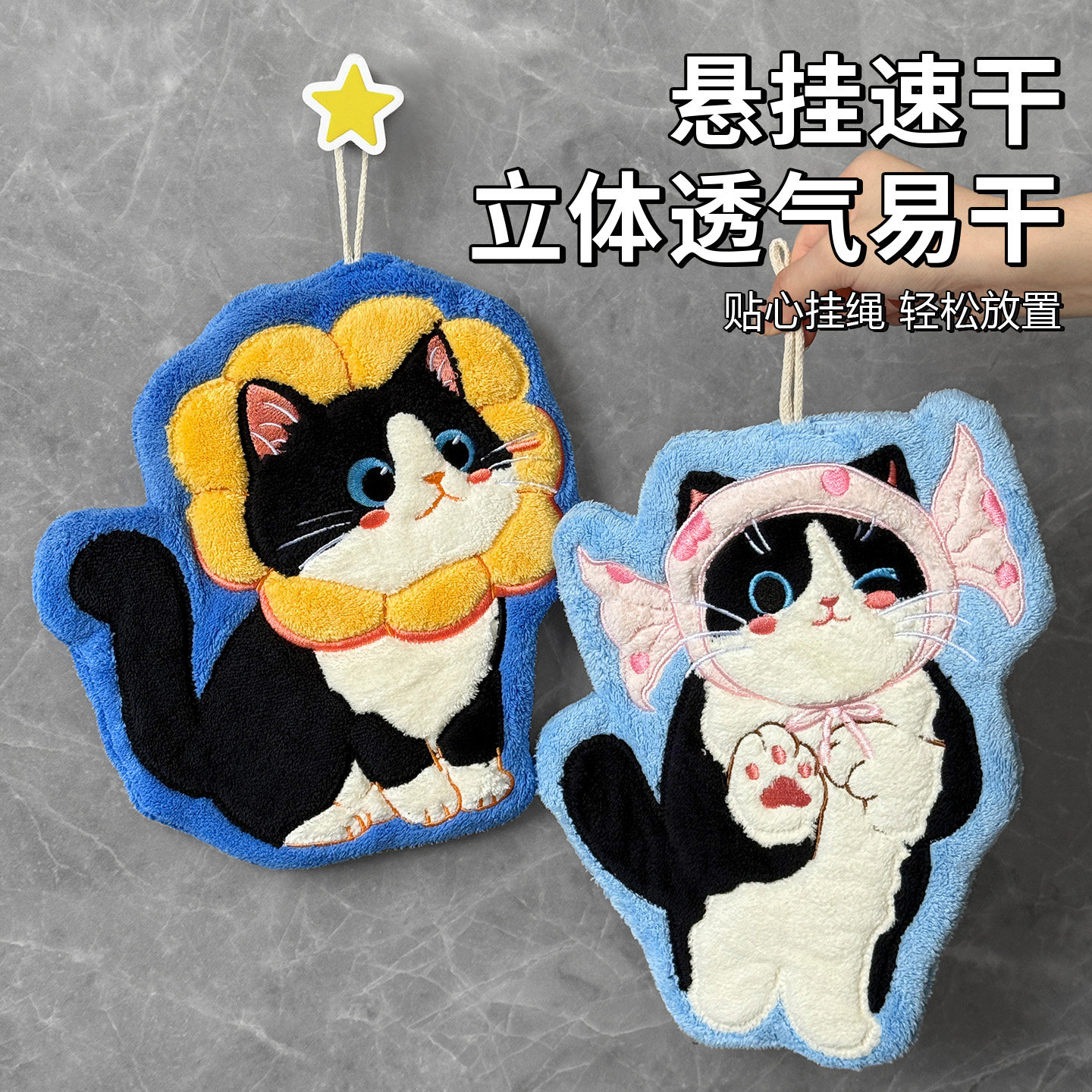 📚 可爱黑猫珊瑚绒擦手巾卡通大号可挂式超强吸水加厚浴室厨房擦手布
