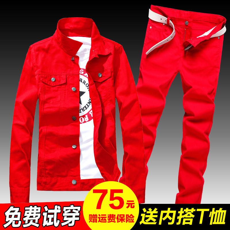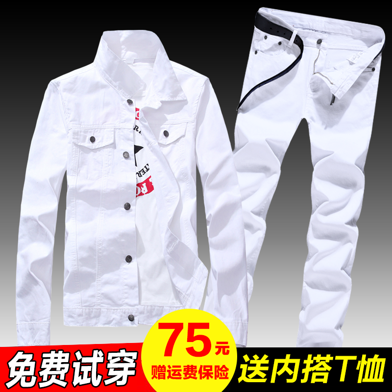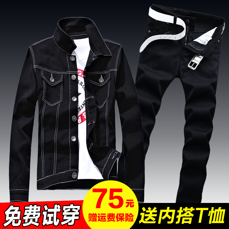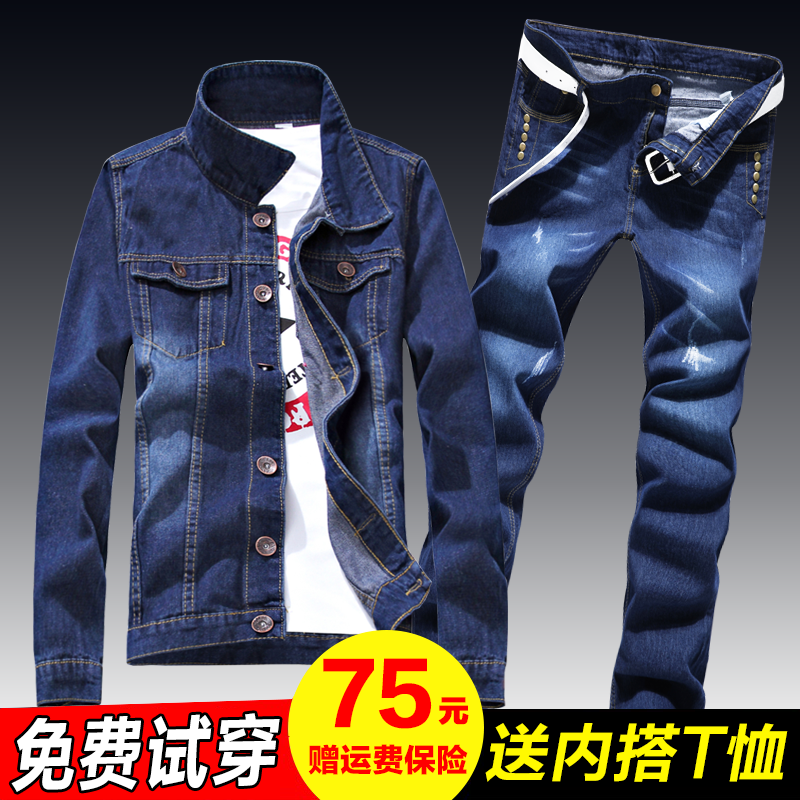 📚 春秋季男士韩版修身夹克牛仔裤子一套装休闲帅气潮流外套衣服褂子