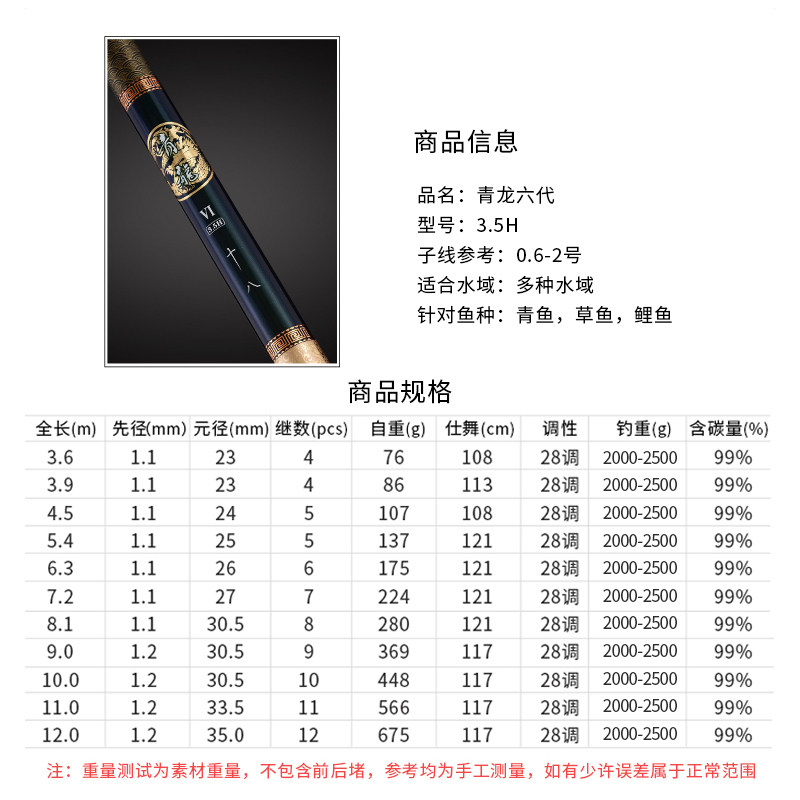 📚 金泉钓具青龙六代钓鱼竿 手竿超轻超硬28调碳素台钓竿3.6米鱼杆