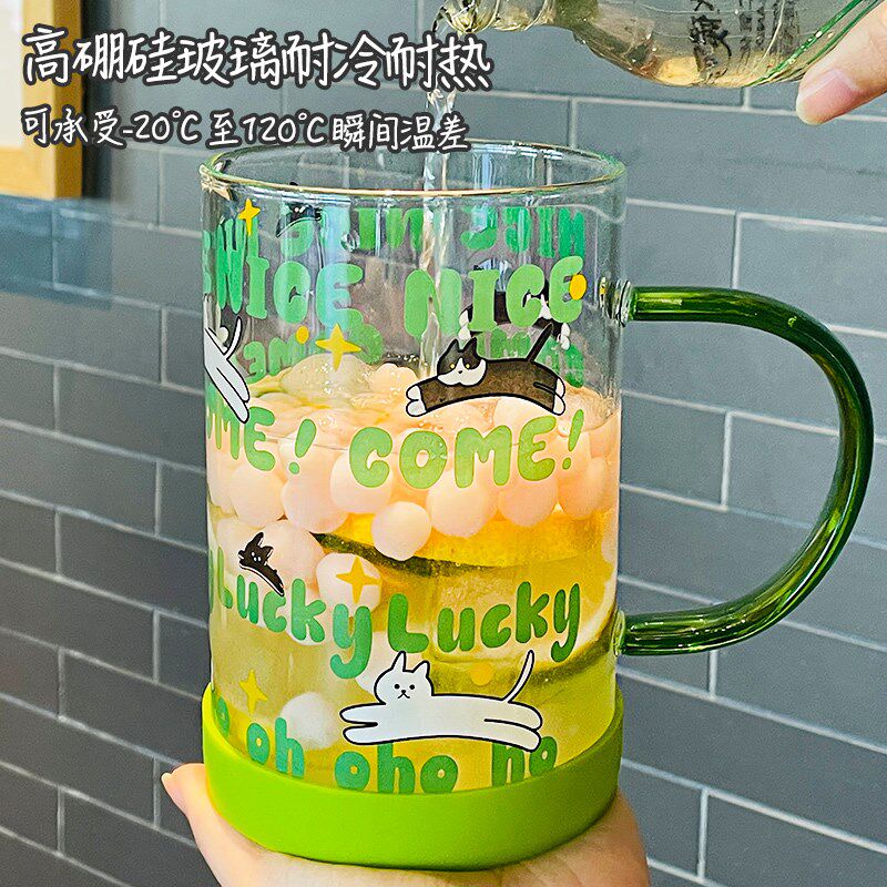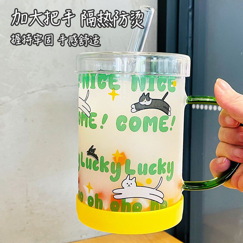 📚 大容量高硼硅玻璃杯女粗吸管奶茶杯带盖把手杯子学生创意卡通水杯