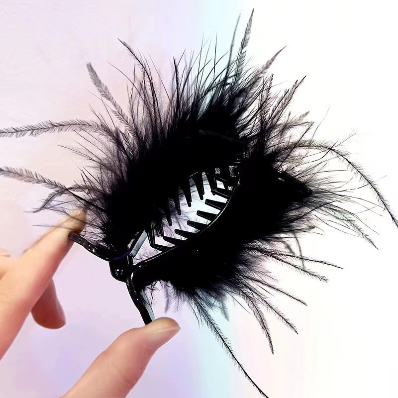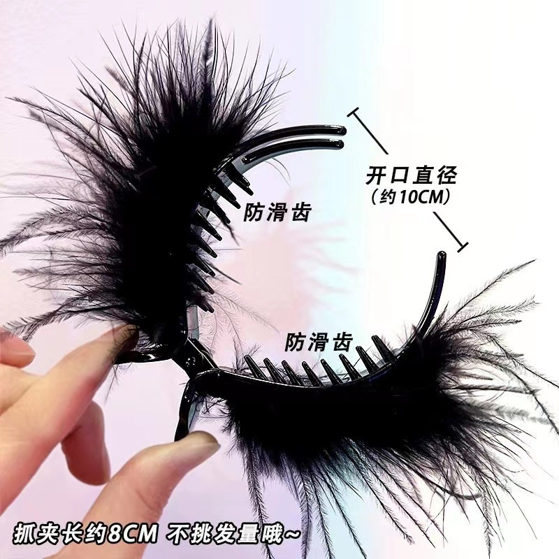 📚 丸子头抓夹秋冬高级感黑色羽毛显蓬松扎马尾发夹女后脑勺鲨鱼夹