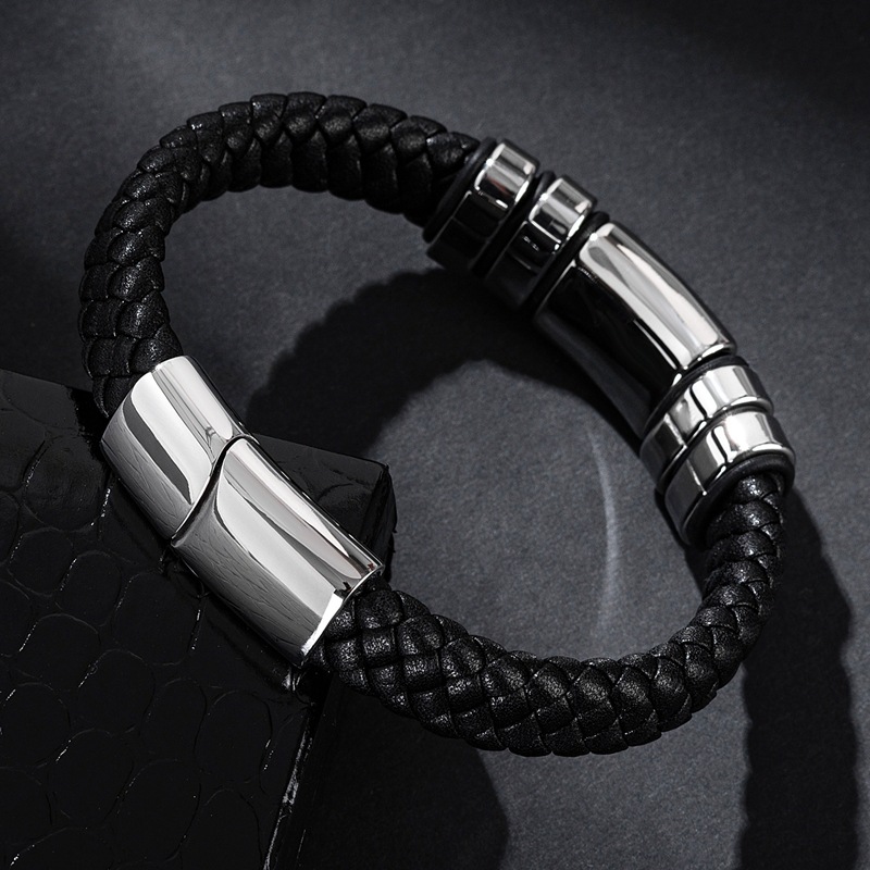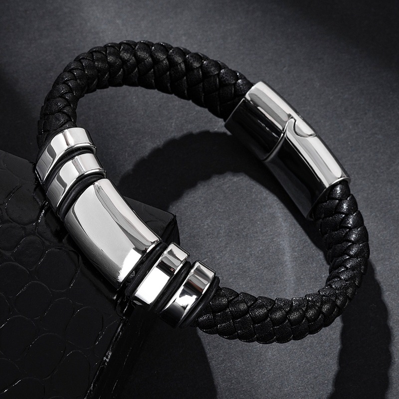 📚 欧美时尚黑色皮绳编织手链简约百搭钛钢手镯男女刻字logo定制手饰