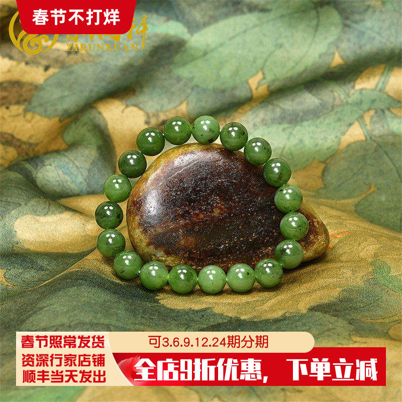📚 紫润轩新疆和田玉玛纳斯碧玉籽料手链10MM菠菜绿圆珠手串男女款
